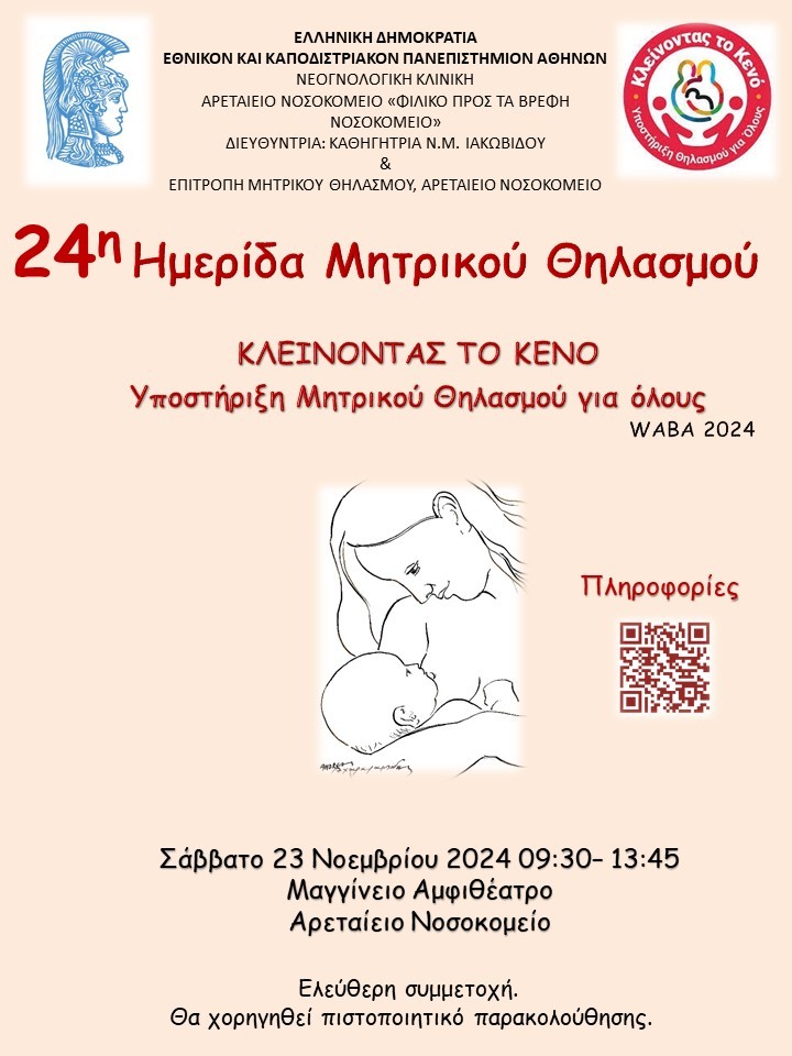 H 24η Ημερίδα Μητρικού Θηλασμού «ΚΛΕΙΝΟΝΤΑΣ ΤΟ ΚΕΝΟ: Υποστήριξη Μητρικού Θηλασμού για όλους», θα πραγματοποιηθεί, το Σάββατο 23 Νοεμβρίου 2024, 09:30-13:45, στο Μαγγίνειο Αμφιθέατρο του Αρεταιείου Νοσοκομείου. Δείτε το πρόγραμμα της ημερίδας: