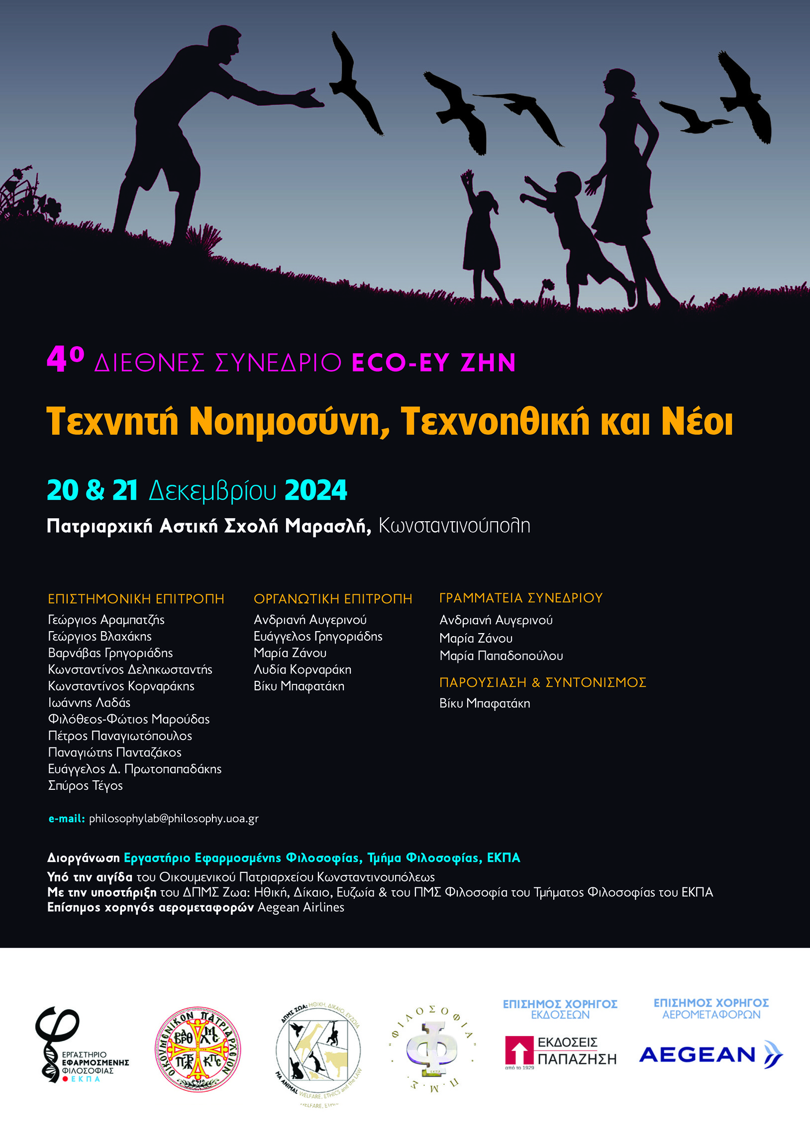Το Εργαστήριο Εφαρμοσμένης Φιλοσοφίας του Τμήματος Φιλοσοφίας του Εθνικού και Καποδιστριακού Πανεπιστημίου Αθηνών, σε συνεργασία με το Οικουμενικό Πατριαρχείο Κωνσταντινουπόλεως, το ΔΠΜΣ Ζώα: Ηθική, Δίκαιο, Ευζωία και το ΠΜΣ Φιλοσοφία του Τμήματος Φιλοσοφίας του ΕΚΠΑ, διοργανώνουν διεθνές επιστημονικό συνέδριο υπό τον τίτλο: «Eco-Ευ ζην: Τεχνητή Νοημοσύνη, Τεχνοηθική και Νέοι» στην Κωνσταντινούπολη στις 20 και 21 Δεκεμβρίου 2024. Το συνέδριο θα διεξαχθεί στην Πατριαρχική Αστική Σχολή Μαρασλή.