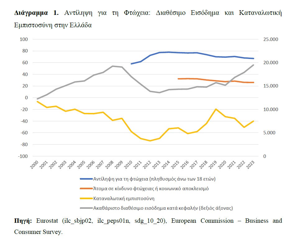 Η σχετική θέση των Ελλήνων σε σύγκριση με τους υπόλοιπους Ευρωπαίους παρουσιάζει σημαντική υστέρηση (Διάγραμμα 1). Στον δείκτη της υποκειμενικής φτώχειας (πιστεύουν ότι είναι φτωχοί) το 2023, το ποσοστό αυτό διαμορφώθηκε στο 67,1% στην Ελλάδα, ενώ στην Ευρωζώνη ήταν 18,4%. Μεταξύ των κατόχων τριτοβάθμιας εκπαίδευσης, το ποσοστό στην Ελλάδα ήταν 46,7% έναντι 9,6% στην Ευρωζώνη (καλύτερη θέση και εικόνα της πραγματικότητας). Στον δείκτη του κινδύνου φτώχειας ή κοινωνικού αποκλεισμού το 2023, το ποσοστό αυτό για την Ελλάδα ανήλθε σε 26,1%, συγκριτικά με το μέσο όρο της Ευρωζώνης που ήταν 21,6%. Επίσης στον δείκτη καταναλωτικής εμπιστοσύνης (ευαίσθητος βραχυχρόνιος δείκτης), ενώ για την Ευρωζώνη το 2023 ήταν -17, στην Ελλάδα έφτανε το -40, δείχνοντας χαμηλά επίπεδα αισιοδοξίας για την οικονομική τους κατάσταση.