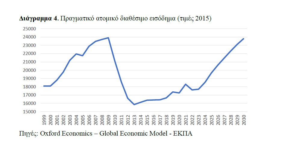 Οι διαφορές στην παραγωγικότητα όμως «δείχνουν» ως υπεύθυνους της εισοδηματικής καθυστέρησης το παραγωγικό πρότυπο της οικονομίας και το επενδυτικό κενό. Με άλλα λόγια, η βελτίωση στους μισθούς και η εισοδηματική κατάσταση είναι σαφείς (Διαγράμματα 1 και 2), αλλά υπάρχει δρόμος μπροστά μας. Σε όρους πραγματικού διαθέσιμου εισοδήματος το επίπεδο του 2008 το προσεγγίζουμε το 2030 (Διάγραμμα 4).