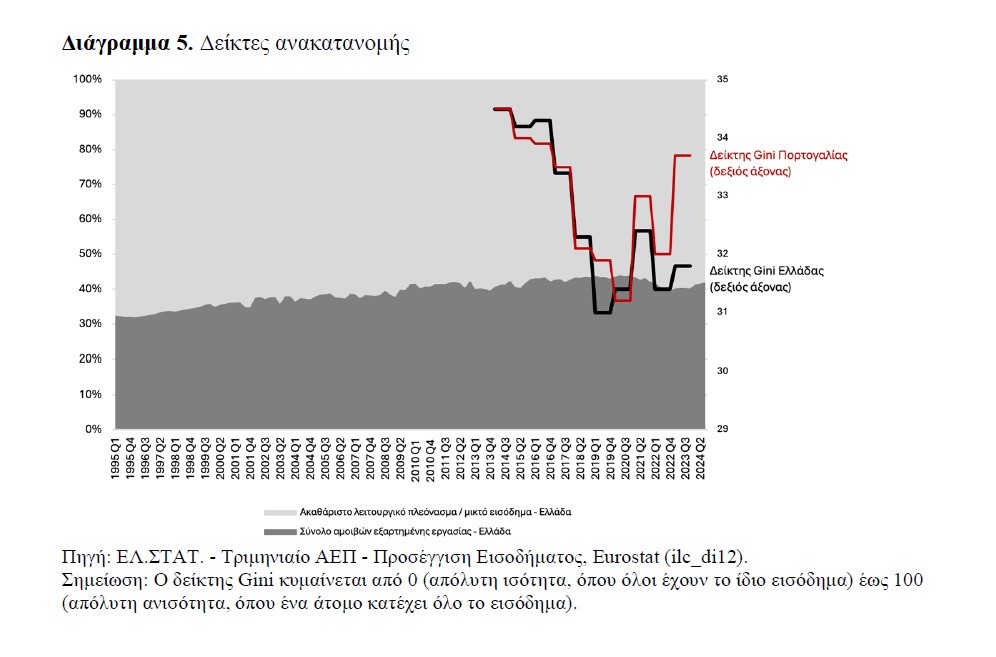 Στο σημείο αυτό πρέπει να τονιστεί ότι κυρίως η δημοσιονομική πολιτική φρόντισε να παρεμβαίνει στην κατανομή του εισοδήματος μειώνοντας τις αποστάσεις μεταξύ των εισοδημάτων στο εσωτερικό της οικονομίας με διαχρονική μείωση της ανισοκατανομής (Gini Gof) και τάση αύξησης των μεριδίων των αμοιβών εξαρτημένης εργασίας έναντι του ακαθάριστου λειτουργικού πλεονάσματος (στις μετρήσεις δεν λαμβάνονται υπόψη η σκιώδης οικονομία και οι μεταφορές εισοδημάτων στο εξωτερικό). Μάλιστα η ανισοκατανομή εισοδημάτων είναι μεγαλύτερη στην Πορτογαλία απ’ ό,τι στην Ελλάδα (Διάγραμμα 5).