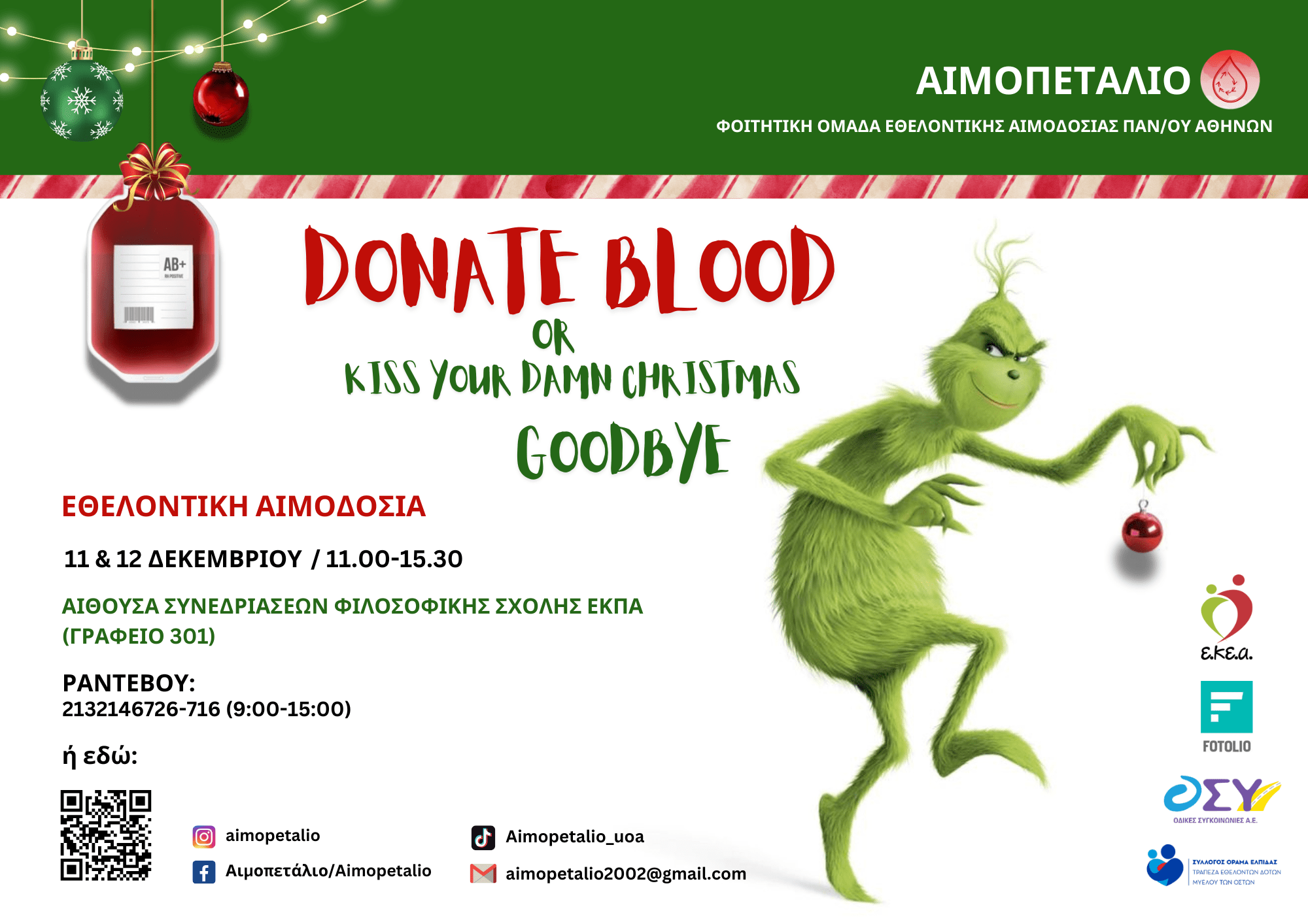 Το Αιμοπετάλιο σας προσκαλεί σε μία ακόμα Χριστουγεννιάτικη Εθελοντική Αιμοδοσία που θα διεξαχθεί στην Αίθουσα Συνεδριάσεων της Φιλοσοφικής Σχολής ΕΚΠΑ (Γραφείο 301) την Τετάρτη 11 και την Πέμπτη 12 Δεκεμβρίου 2024 και ώρες 11:00-15:30, σε συνεργασία με το Ε.ΚΕ.Α.