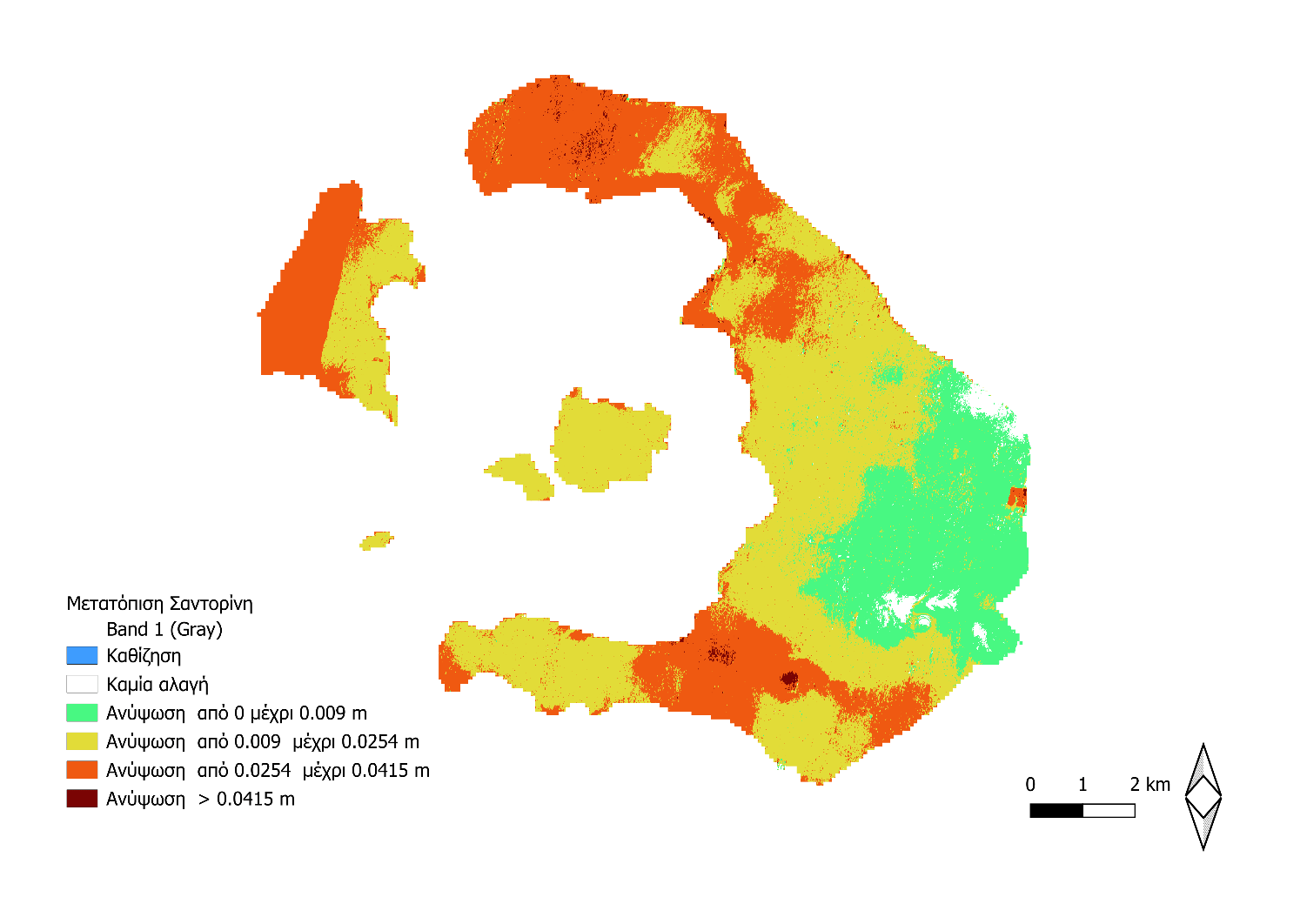 Πιο συγκεκριμένα, αξιοποιήθηκαν δορυφορικές εικόνες στις 31/01/25 και 12/02/2025 από τον δορυφορικό Sentinel-1 (δορυφορικό Radar Συνθετικού Ανοίγματος κεραίας) όπου εφαρμόστηκαν εξειδικευμένες τεχνικές συμβολομετρίας (“InSAR”: Interferometric Synthetic Aperture Radar) και όλες οι επιμέρους απαραίτητες διορθώσεις. Τα αποτελέσματα που απεικονίζονται στην ακόλουθη Εικόνα, αναδεικνύουν ότι προέκυψαν μετατοπίσεις (ανυψώσεις) μεγαλύτερες από 2.5 cm σε πολλά και μεγάλα τμήματα του νησιωτικού συμπλέγματος, με μέγιστη μεταβολή ανύψωσης στα 5 cm. Ελάχιστες περιοχές δεν έχουν υποστεί μετατοπίσεις ή καθιζήσεις λόγω των σεισμικών δονήσεων, ενώ οι πιο πληγείσες περιοχές και αυτές που φέρουν τις μεγαλύτερες μεταβολές της μετατόπισης του εδάφους φαίνεται να είναι κυρίως οι παράκτιες περιοχές.