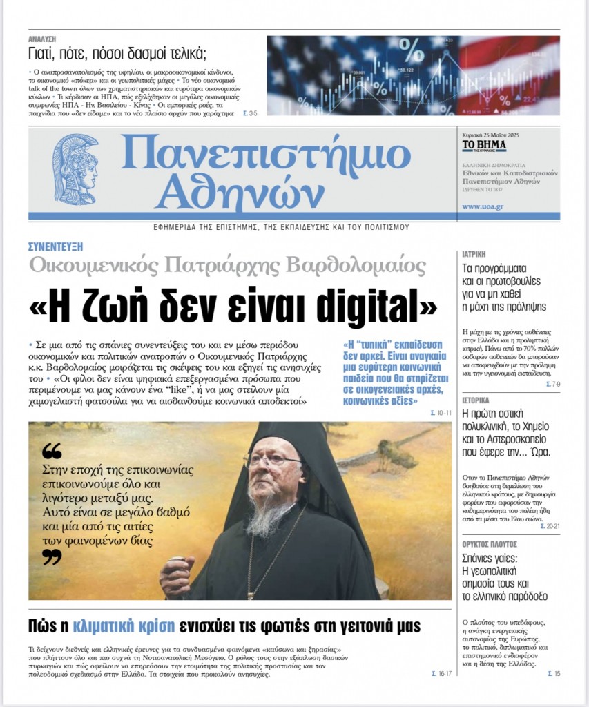 Την Κυριακή 25 Μαΐου, το Πανεπιστήμιο Αθηνών κυκλοφόρησε με το «Βήμα της Κυριακής» το τέταρτο φύλλο της εφημερίδας του υπό τον τίτλο «Πανεπιστήμιο Αθηνών, Εφημερίδα της Επιστήμης, της Εκπαίδευσης και του Πολιτισμού». Στο 4ο φύλλο, στο πρωτοσέλιδο, ως κεντρικό θέμα, φιλοξενείται συνέντευξη του Οικουμενικού Πατριάρχη κ.κ. Βαρθολομαίου με τίτλο «Η ζωή δεν είναι digital».