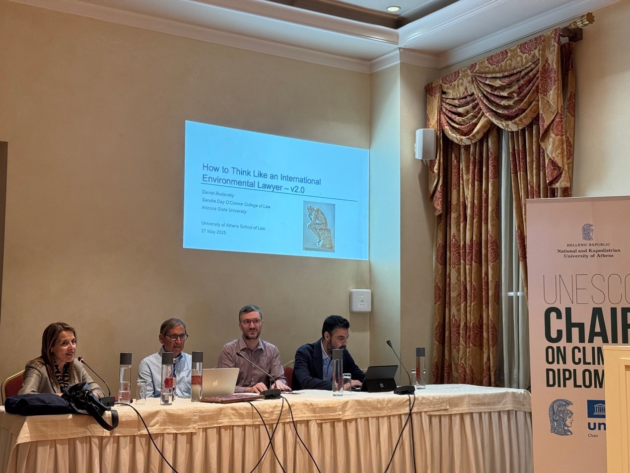 Με μεγάλη επιτυχία πραγματοποιήθηκε την Τρίτη 27 Μαΐου 2025, στο κτήριο «Κωστής Παλαμάς», η εκδήλωση που διοργάνωσε η Έδρα UNESCO για την Κλιματική Διπλωματία του Εθνικού και Καποδιστριακού Πανεπιστημίου Αθηνών (ΕΚΠΑ), με προσκεκλημένο ομιλητή τον Daniel Bodansky, Καθηγητή Διεθνούς Περιβαλλοντικού Δικαίου στο Πανεπιστήμιο της Αριζόνα (Arizona State University). Η εκδήλωση πραγματοποιήθηκε με αφορμή την κυκλοφορία της δεύτερης έκδοσης του βιβλίου του, The Art and Craft of International Environmental Law (Oxford University Press, 2024).