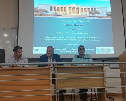 Με μεγάλη επιτυχία πραγματοποιήθηκε την Παρασκευή 27 Σεπτεμβρίου 2024, η εκδήλωση υποδοχής των πρωτοετών φοιτητών του Μεταπτυχιακού Προγράμματος «Εσωτερικός Έλεγχος, Διαχείριση Κινδύνων και Κανονιστική Συμμόρφωση» που προσφέρει το Τμήμα Οικονομικών Επιστημών του Ε.Κ.Π.Α., για το ακαδημαϊκό έτος 2024-2025. Η εκδήλωση έλαβε χώρα στην αίθουσα Αγγελοπούλου (Αριστείδου 11).