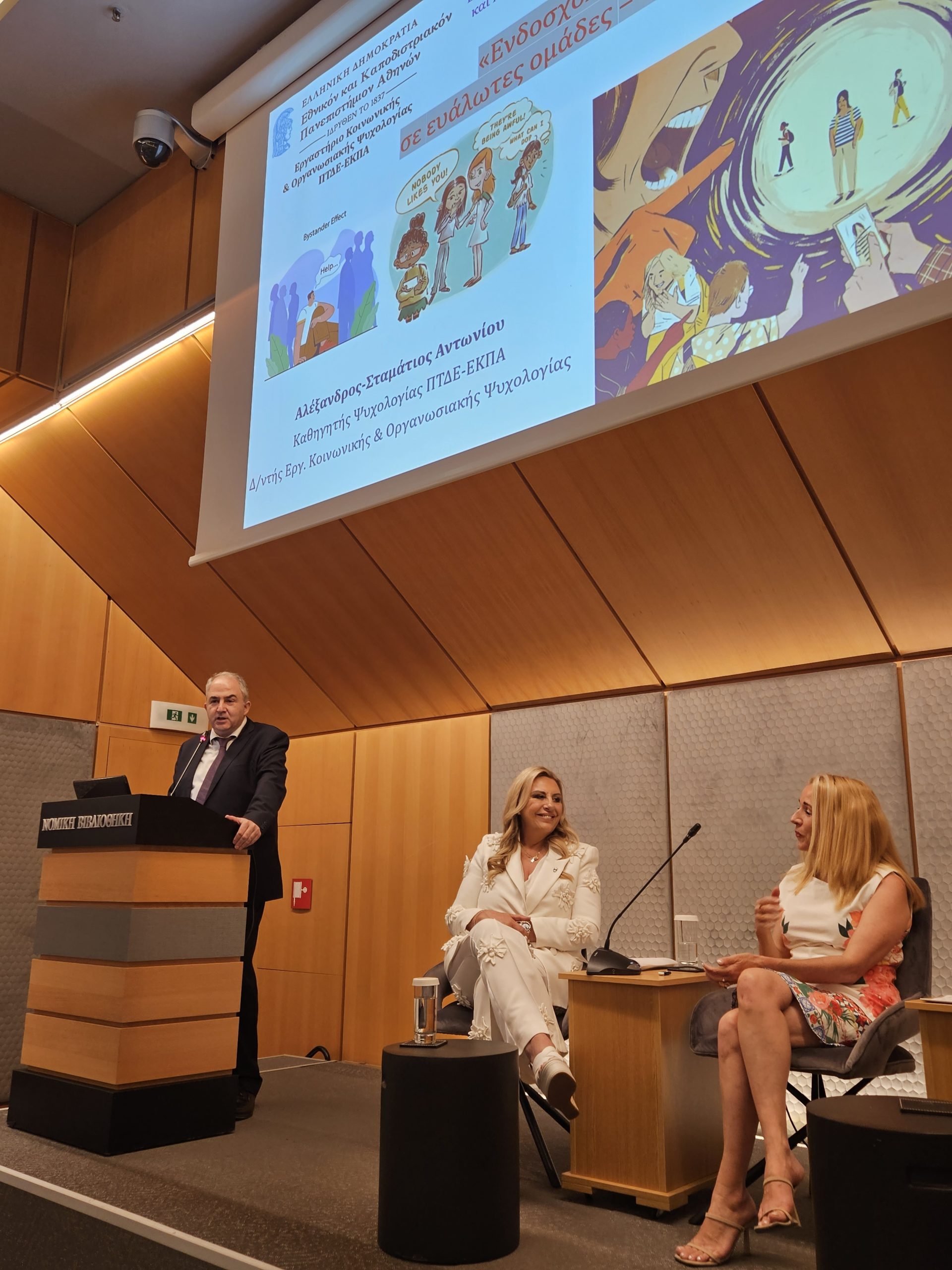 Ο Καθηγητής Ψυχολογίας Αλέξανδρος-Σταμάτιος Αντωνίου, τακτικό μέλος της Επιτροπής για την Ενδοσχολική Βία και τον Εκφοβισμό του ΥΠΑΙΘΑ επικεντρώθηκε στις κοινωνικά ευάλωτες ομάδες τονίζοντας τους ψυχοκοινωνικούς μηχανισμούς οι οποίοι καθιστούν μαθήτριες και μαθητές με αναπηρία, ΛΟΑΤΚΙ+ εφήβους και παιδιά μεταναστών και προσφύγων περισσότερο εκτεθειμένους σε φαινόμενα βίας και κοινωνικού αποκλεισμού. Παρουσίασε δεδομένα από πρόσφατες διεθνείς και ελληνικές μελέτες οι οποίες καταδεικνύουν την πολλαπλή και διαρκή έκθεση αυτών των ομάδων τόσο εντός όσο και εκτός σχολικού περιβάλλοντος. Τέλος, έδωσε έμφαση στην ανάγκη διατομεακών πολιτικών πρόληψης, ενδυνάμωσης και καλλιέργειας κουλτούρας αποδοχής και συμπερίληψης και κατέθεσε προτάσεις εκπαιδευτικής και πολιτικής παρέμβασης με ιδιαίτερη αναφορά στην ενσυναίσθηση και την πολύπλευρη συνεργασία φορέων.