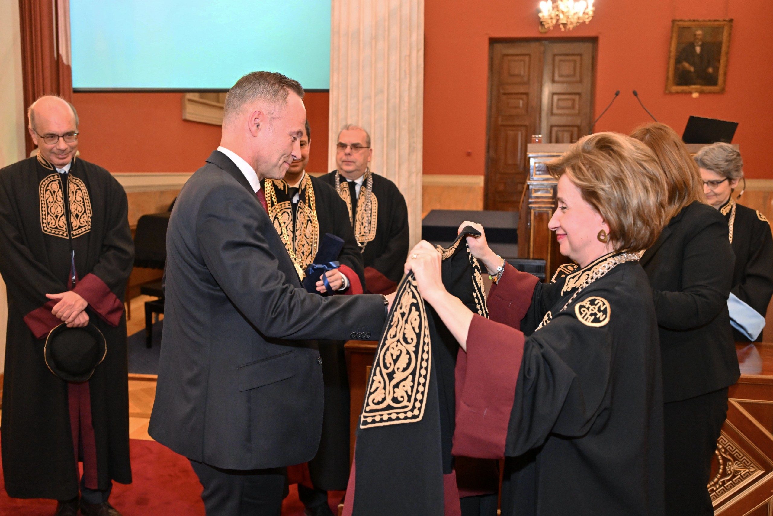 Την περιένδυση του τιμωμένου με την τήβεννο της Σχολής έκανε η Κοσμήτορας της Σχολής Επιστημών Υγείας, καθηγήτρια Παγώνα Λάγιου.