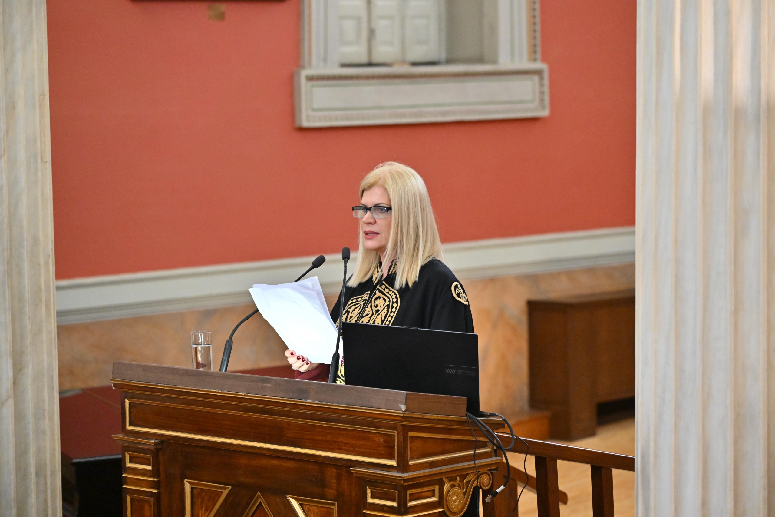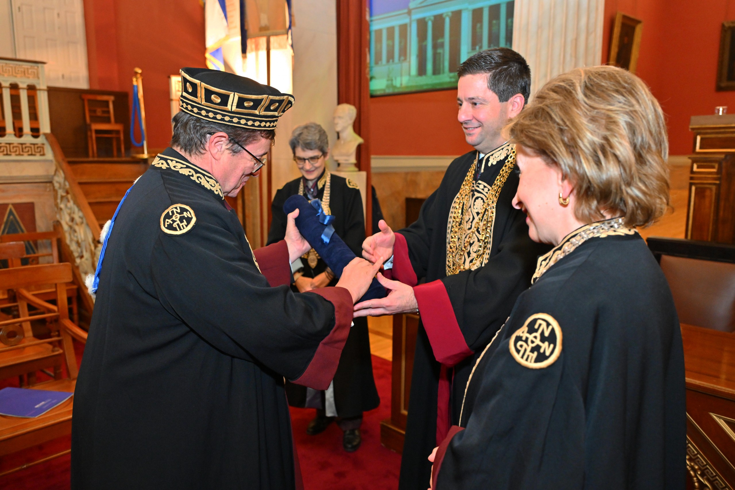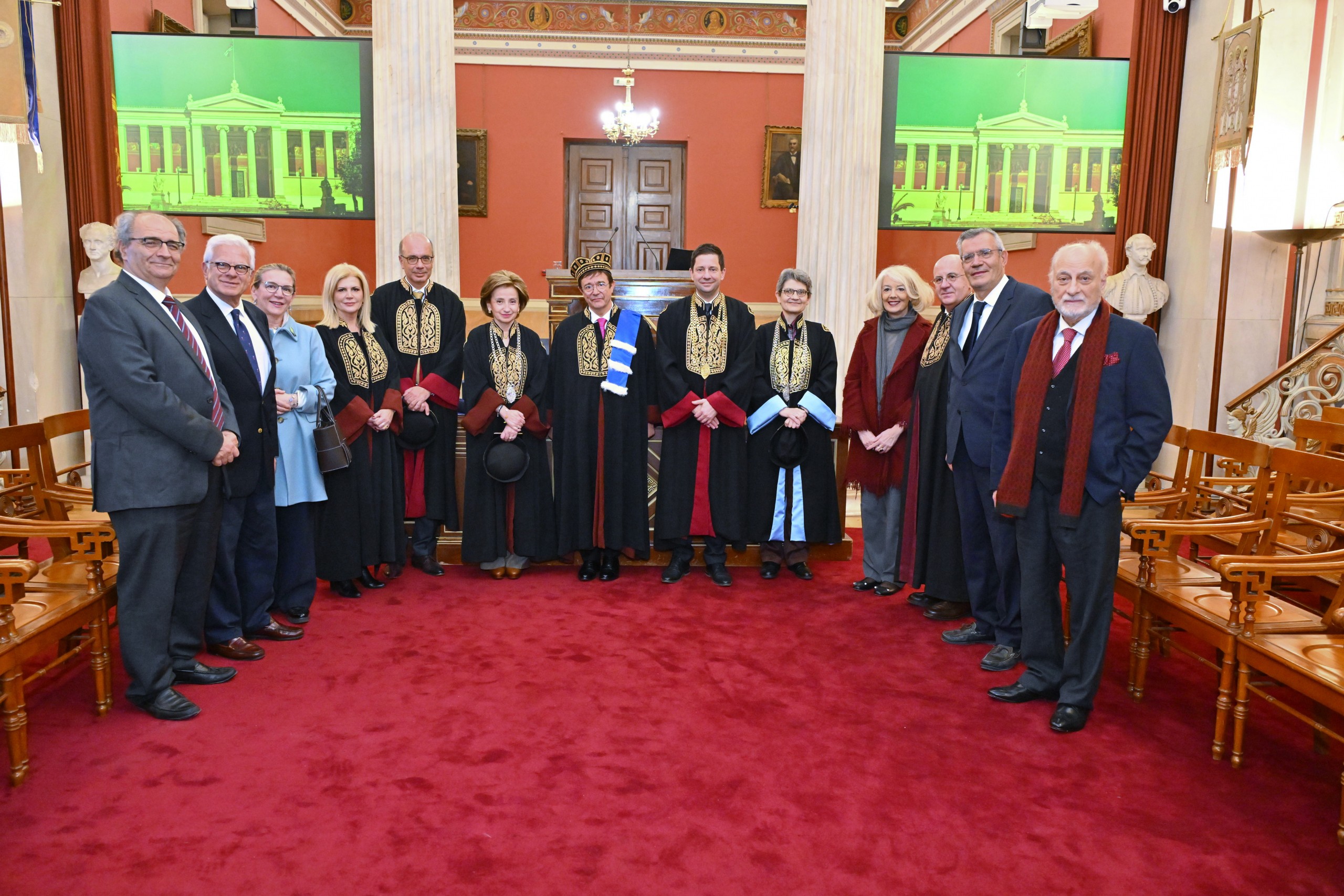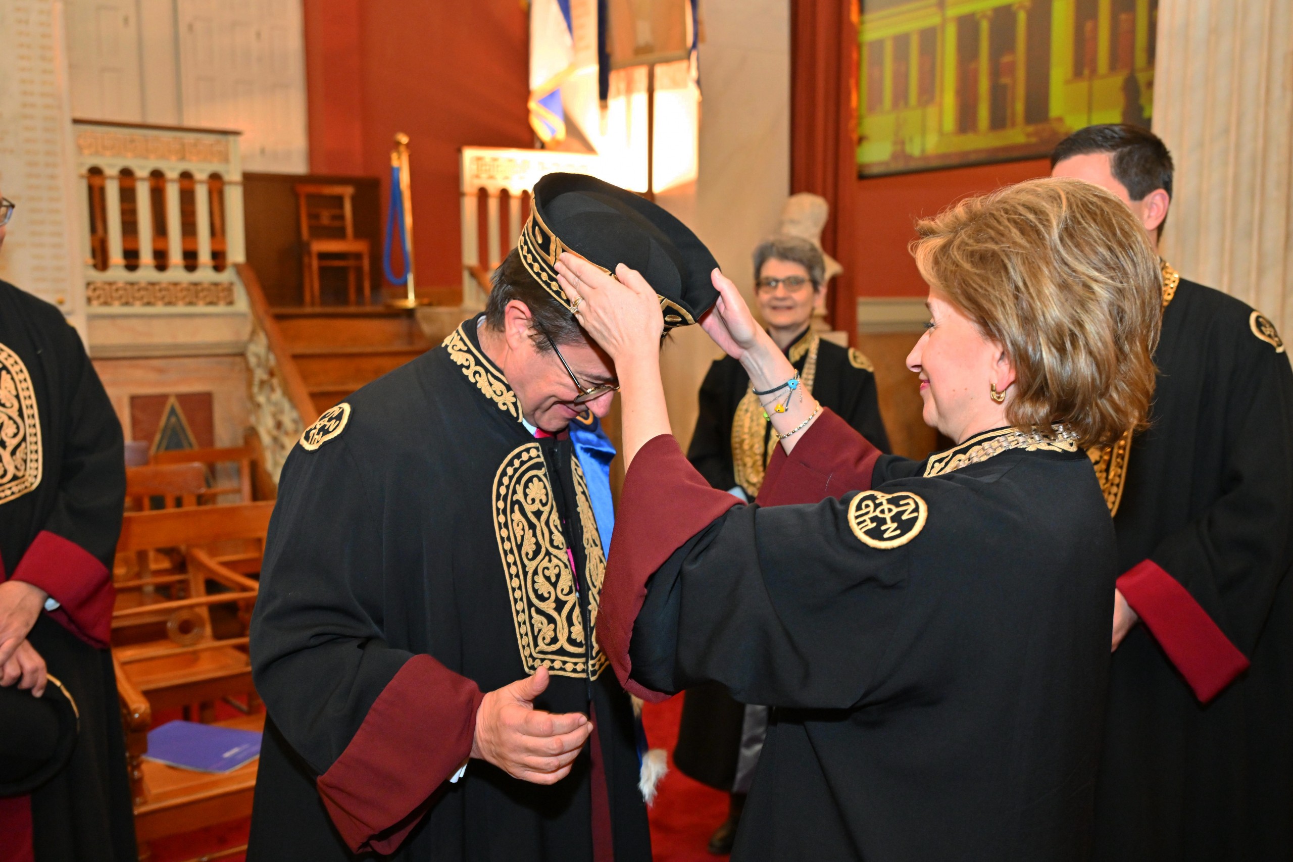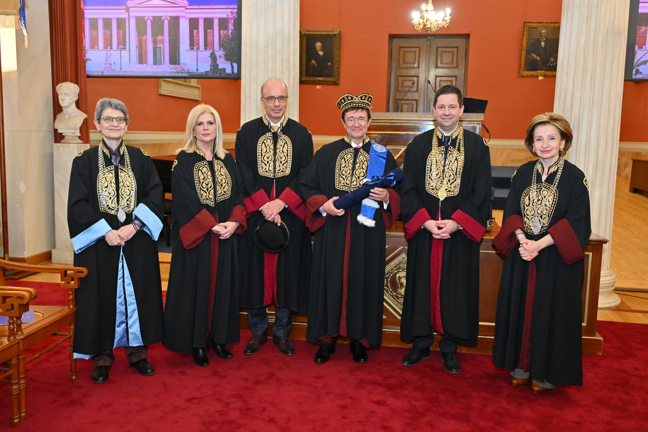 Η περιένδυση του τιμωμένου με την τήβεννο της Σχολής έγινε από την Κοσμήτορα της Σχολής Επιστημών Υγείας, καθηγήτρια Παγώνα Λάγιου.