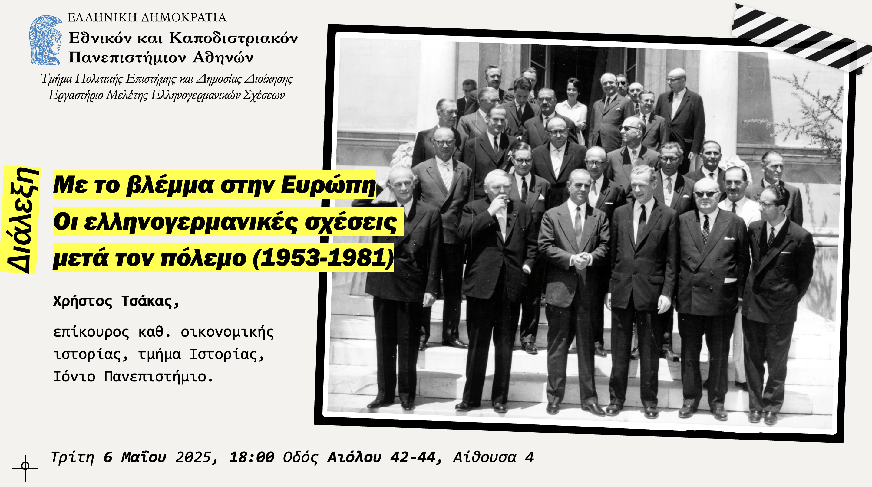 Στις 6 Μαϊου 2025, ώρα 6-8μμ, ο επίκουρος καθηγητής Οικονομικής Ιστορίας του τμήματος Ιστορίας του Ιονίου Πανεπιστήμιου, κ. Χρήστος Τσάκας, θα πραγματοποιήσει διάλεξη υπό τον τίτλο “Με το βλέµµα στην Ευρώπη. Οι ελληνογερµανικές σχέσεις µετά τον πόλεµο (1953-1981)”, ως προσκεκλημένος ομιλητής του Εργαστηρίου Μελέτης Ελληνογερμανικών Σχέσεων του ΕΚΠΑ. Η διάλεξη θα πραγματοποιηθεί στο κτήριο της οδού Αιόλου 42-44 (2ος όροφος, αίθουσα 4).