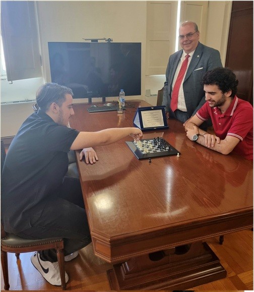 Ο κ.Αντιπρύτανης συνεχάρη τους φοιτητές για τις επιτυχίες τους και την αξιόλογη πορεία της σκακιστικής ομάδας και συζήτησε μαζί τους για τις μελλοντικές σκακιστικές δράσεις, τονίζοντας την εκπαιδευτική αξία του αθλήματος. Ευχήθηκε πολλές επιτυχίες και στις επόμενες αθλητικές διοργανώσεις επισημαίνοντας τη σταθερή συμπαράστασή του στις προσπάθειες όλων των φοιτητών.