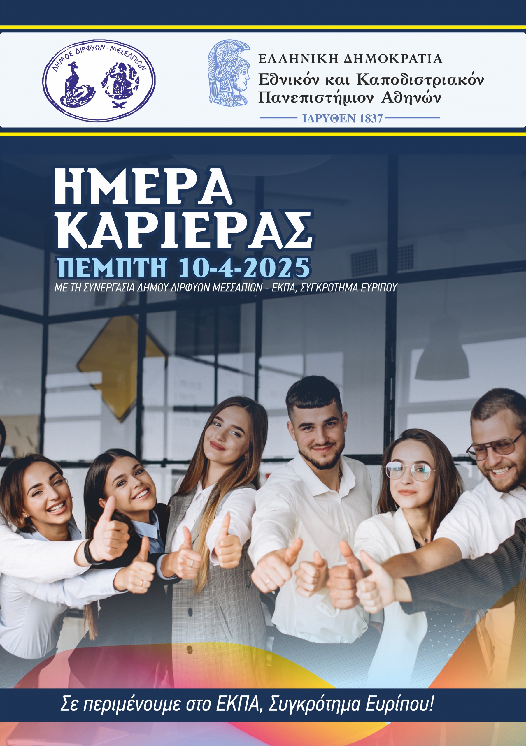Την Πέμπτη 10 Απριλίου 2025, στο Αμφιθέατρο του Εθνικού και Καποδιστριακού Πανεπιστημίου Αθηνών, Συγκρότημα Ευρίπου θα πραγματοποιηθεί για 2η συνεχή χρονιά η «Ημέρα Καριέρας» μια εκδήλωση συνεργασίας του Δήμου Διρφυών Μεσσαπίων με το Εθνικό και Καποδιστριακό Πανεπιστήμιο Αθηνών, Συγκρότημα Ευρίπου.