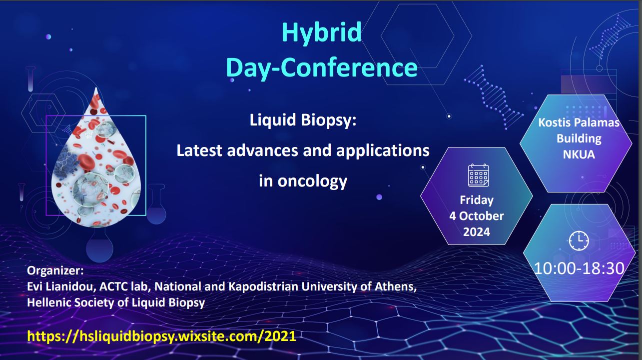 Την Παρασκευή, 4 Οκτωβρίου 2024, πραγματοποιήθηκε στο κτίριο «Κωστής Παλαμάς» του ΕΚΠΑ Υβριδική Ημερίδα με θέμα: «Liquid Biopsy: Latest Advances & Applications in Oncology». Την Ημερίδα διοργάνωσε η Καθ. Εύη Λιανίδου, Καθηγήτρια Αναλυτικής Χημείας και Κλινικής Χημείας του ΕΚΠΑ και Πρόεδρος της Ελληνικής Εταιρείας Υγρής Βιοψίας (ΕΕΥΒΙ).