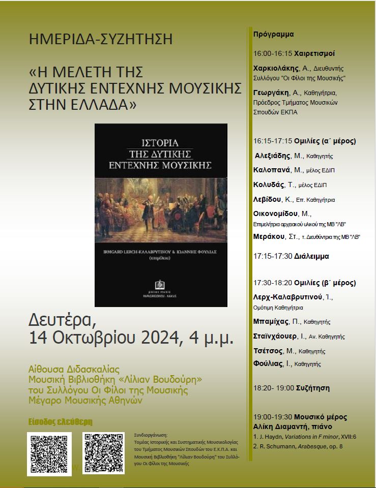 Με αφορμή την κυκλοφορία του βιβλίου «Ιστορία της Δυτικής Έντεχνης Μουσικής», που επιμελήθηκαν οι Καθηγητές Irmgard Lerch-Καλαβρυτινού και Ιωάννης Φούλιας και εξέδωσε ο εκδοτικός οίκος Παπαγρηγορίου-Νάκας, ο Τομέας Ιστορικής και Συστηματικής Μουσικολογίας του Τμήματος Μουσικών Σπουδών του Ε.Κ.Π.Α. και η Μουσική Βιβλιοθήκη “Λίλιαν Βουδούρη” του Συλλόγου Οι Φίλοι της Μουσικής συνδιοργανώνουν ημερίδα-συζήτηση στις 14 Οκτωβρίου 2024 (αίθουσα Διδασκαλίας) με θέμα «Η μελέτη της δυτικής έντεχνης μουσικής στην Ελλάδα».