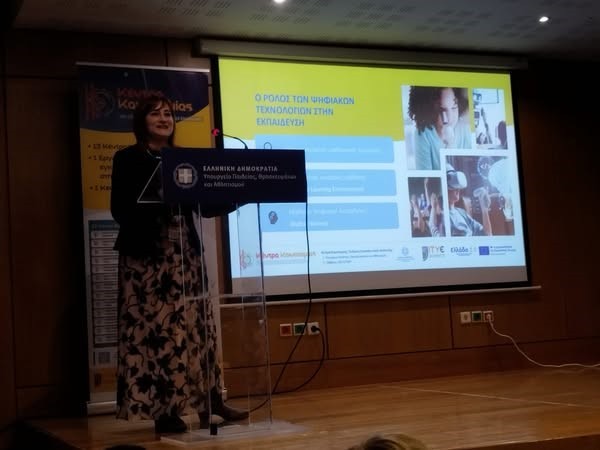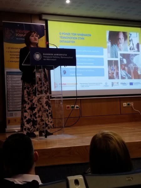 Η κα. Σμυρναίου στην ομιλία της παρουσίασε, αρχικά, τα νέα ευρωπαϊκά πλαίσια ψηφιακών δεξιοτήτων με τον ευρωπαϊκό στόχο για τον ψηφιακό μετασχηματισμό της εκπαίδευσης και την ευρωπαϊκή στρατηγική για την τεχνητή νοημοσύνη. Στη συνέχεια, παρουσίασε το όραμα, το έργο και τις αρχές των Κέντρων Καινοτομίας, τα οποία θα ενισχύσουν τις γνωστικές δεξιότητες των μαθητών/τριών, συμμετέχοντας σε εκπαιδευτικά σενάρια τεχνητής νοημοσύνης, θα βοηθήσουν στη διάδραση της εκπαιδευτικής κοινότητας, θα ενισχύσουν τη συνέργεια όλων των εκπαιδευτικών, ερευνητικών, πανεπιστημιακών και πολιτικών φορέων προς όφελος της μαθητικής κοινότητας και θα προσφέρουν περιβάλλοντα όπου οι μαθητές/τριες θα έχουν την ευκαιρία να ενδυναμωθούν ως μελλοντικοί πολίτες, εργαζόμενοι, ερευνητές με στόχο την ωφέλιμη και ασφαλή προσαρμογή, αξιοποίηση και ανάπτυξη λύσεων Τεχνητής Νοημοσύνης. Η κα. Σμυρναίου τόνισε τις νέες ψυχοπαιδαγωγικές προσεγγίσεις που απαιτείται να υιοθετηθούν και στα νέα ψηφιακά πλαίσια μάθησης, καθώς ο μαθητής/τρια πρέπει αφενός να βρίσκεται στο επίκεντρο της μαθησιακής διαδικασίας και αφετέρου να μπορεί να αξιολογεί τι μαθαίνει δρώντας στον πραγματικό, στον συμβολικό και στον ψηφιακό κόσμο. Η ημερίδα έκλεισε με στρογγυλή τράπεζα και συζήτηση για τις προκλήσεις και τις προοπτικές των Κέντρων Καινοτομίας ως βασικών πυλώνων εκπαιδευτικής ανάπτυξης, με τη συμμετοχή των άμεσα εμπλεκομένων στην δράση.