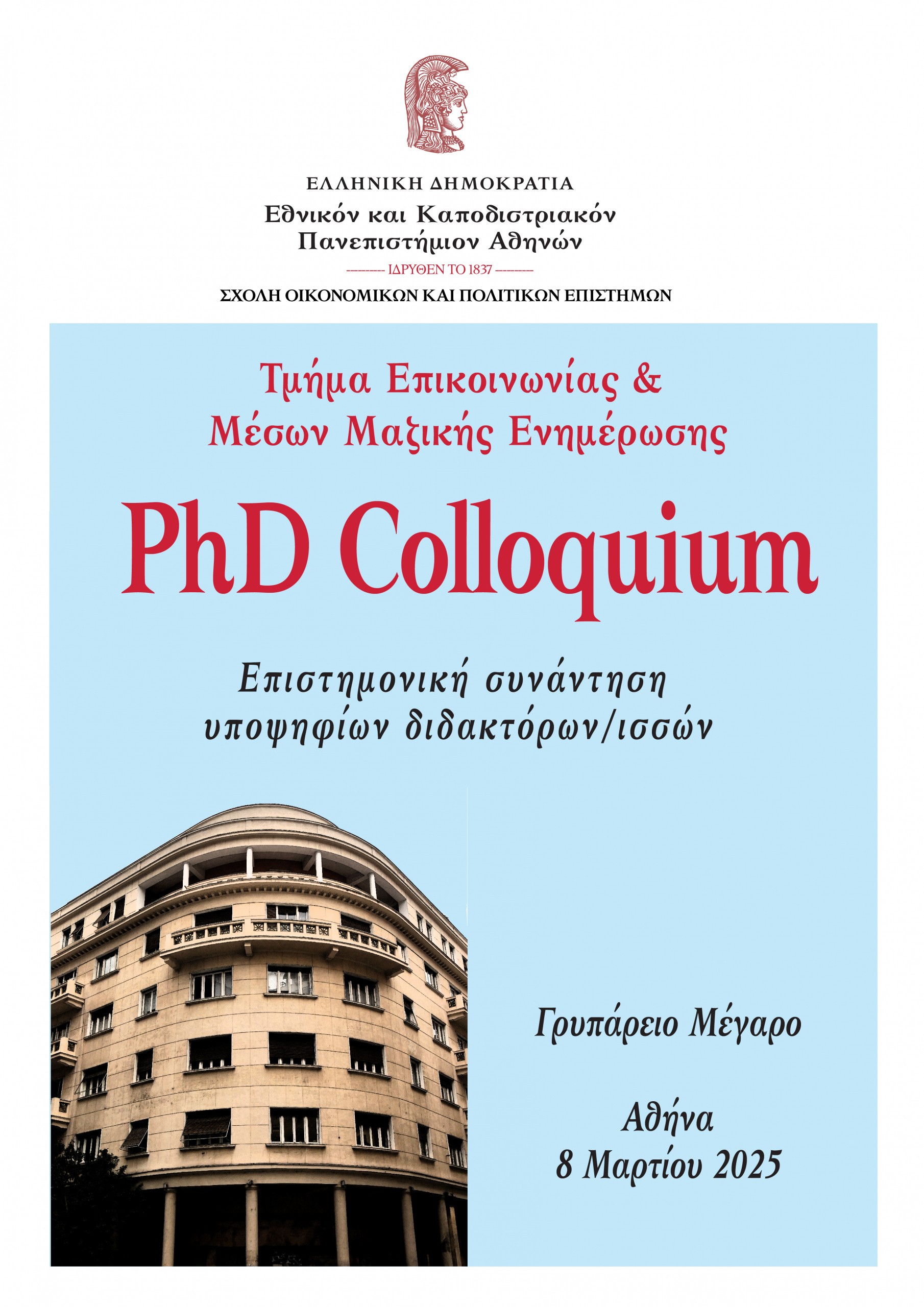 Με επίκεντρο την έρευνα αιχμής στον χώρο της επικοινωνίας, πραγματοποιήθηκε το Σάββατο 8 Μαρτίου 2025 η ημερίδα των υποψηφίων διδακτόρων-ισσών του Τμήματος Επικοινωνίας και Μέσων Μαζικής Ενημέρωσης του ΕΚΠΑ. Στην ημερίδα συμμετείχαν νέοι ερευνητές και ερευνήτριες του Τμήματος. Η παρουσίαση των εργασιών τους ανέδειξε τον διεπιστημονικό χαρακτήρα των επικοινωνιακών σπουδών, καθώς και το υψηλό επίπεδο της έρευνας που διεξάγεται στο Τμήμα, σε στενή σύνδεση με τις σύγχρονες εξελίξεις στο πεδίο της επικοινωνίας.