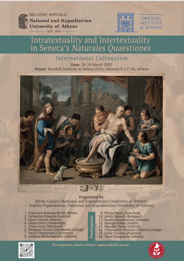 Το διήμερο 28 και 29 Μαρτίου 2025 πραγματοποιήθηκε στο Σουηδικό Ινστιτούτο Αθηνών (SIA) διεθνές Colloquium με θέμα “Intratextuality and Intertextuality in Seneca’s Naturales Quaestiones”. Το συνέδριο συνδιοργανώθηκε από την Αντιπρύτανι Ακαδημαϊκών, Διεθνών Σχέσεων και Εξωστρέφειας, καθηγήτρια Σοφία Παπαϊωάννου (Τμήμα Φιλολογίας, ΕΚΠΑ) και την αναπληρώτρια καθηγήτρια Μυρτώ Γκαράνη (Τμήμα Φιλολογίας, ΕΚΠΑ) και το Σουηδικό Ινστιτούτο Αθηνών (SIA), με την ευγενική υποστήριξη του Τμήματος Φιλολογίας (ΕΚΠΑ), του Εθνικού και Καποδιστριακού Πανεπιστημίου Αθηνών, του Σουηδικού Ινστιτούτου Αθηνών και του ελβετικού ιδρύματος PLuS (Patrum Lumen Sustine-Stiftung).