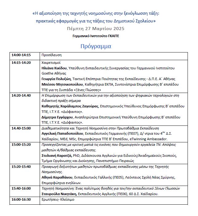Περισσότεροι από 200 εκπαιδευτικοί Αγγλικής, Γαλλικής και Γερμανικής, από σχολεία Πρωτοβάθμιας και Δευτεροβάθμιας Εκπαίδευσης, καθώς και Σύμβουλοι Εκπαίδευσης, φοιτητές και φοιτήτριες, καθώς και πανεπιστημιακοί, συμμετείχαν στις επιμορφωτικές δράσεις που πραγματοποιήθηκαν στο Γαλλικό Ινστιτούτο (4 Μαρτίου 2025) και στο Ινστιτούτο Γκαίτε (27 Μαρτίου 2025), με θέμα την εφαρμογή της ΤΝ στο γλωσσικό μάθημα.