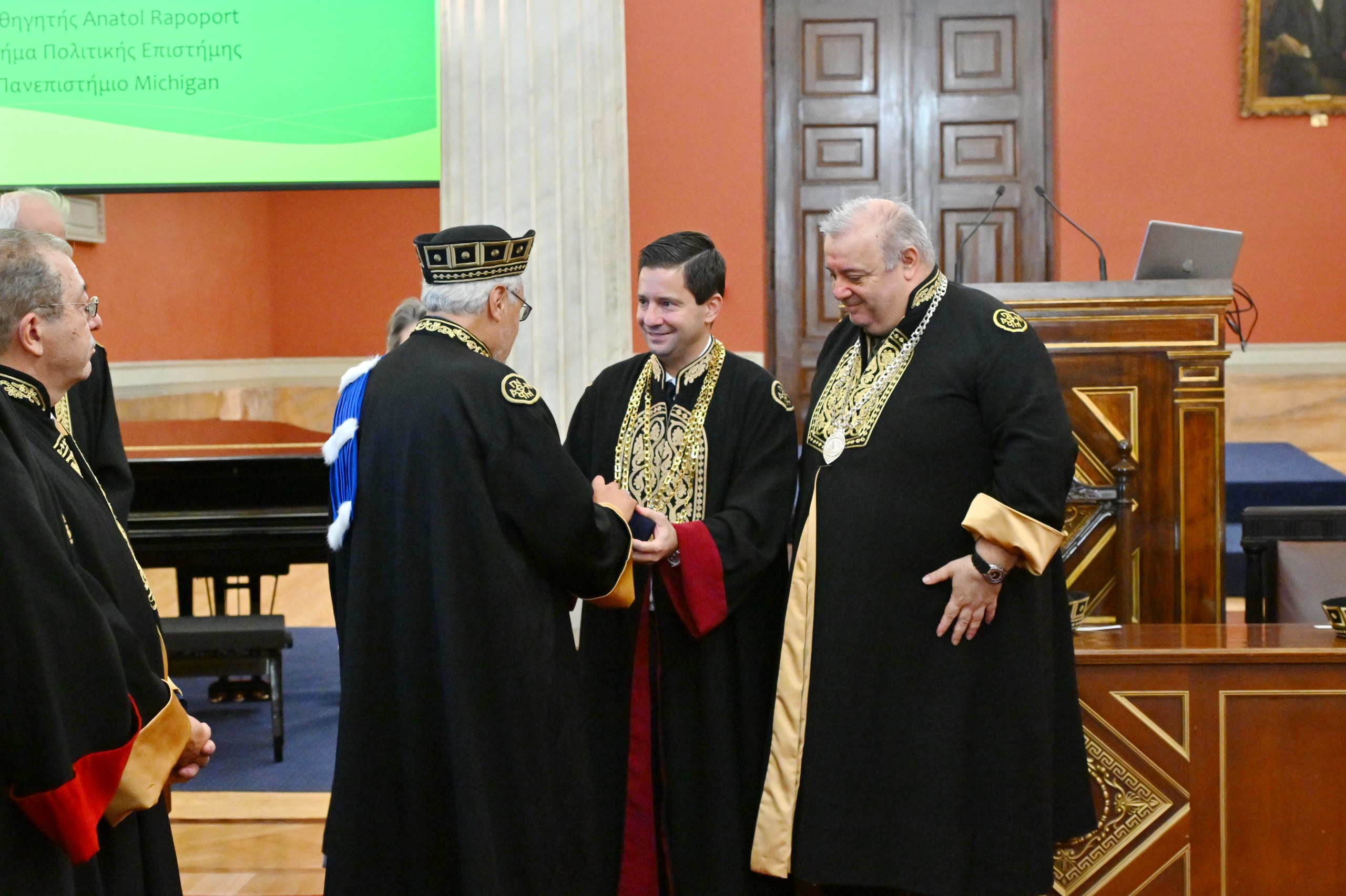 Η περιένδυση του τιμωμένου με την τήβεννο της Σχολής έγινε από τον Κοσμήτορα της Σχολής Οικονομικών και Πολιτικών Επιστημών, καθηγητή Νικόλαο Ηρειώτη.