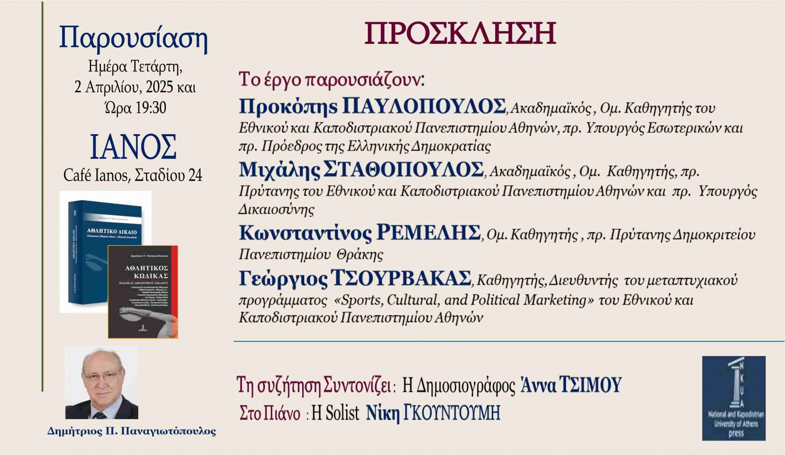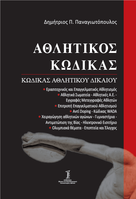 Οι δύο τόμοι του καθηγτή Αθλητικού Δικαίου του Πανεπιστημίου Αθηνών Δημητρίου Π. Παναγιωτόπουλου, «Αθλητικό Δίκαιο» και «Αθλητικός Κώδικας», και τα δύο από τις Εκδόσεις του Εθνικού και Καποδιστριακού Πανεπιστημίου Αθηνών, παρουσιάζονται στις 2 Απριλίου 2025 και ώρα 19.30 μμ, στο Café Ianos, Σταδίου 24