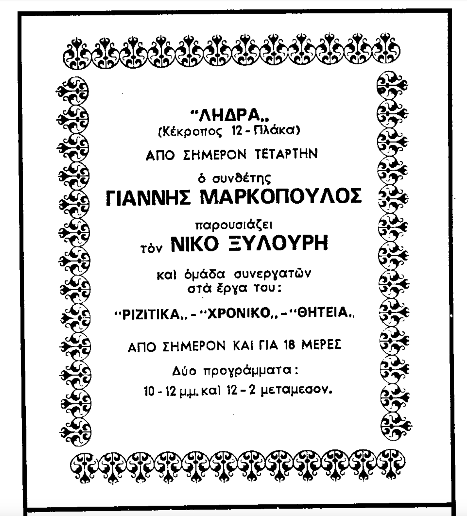 1) Πρόβα στη μπουάτ Λήδρα. Διακρίνεται ο Γιάννης Μαρκόπουλος στο πιάνο και ο Νίκος Ξυλούρης, όρθιος δίπλα του. Αρχείο Γιάννη Μαρκόπουλου