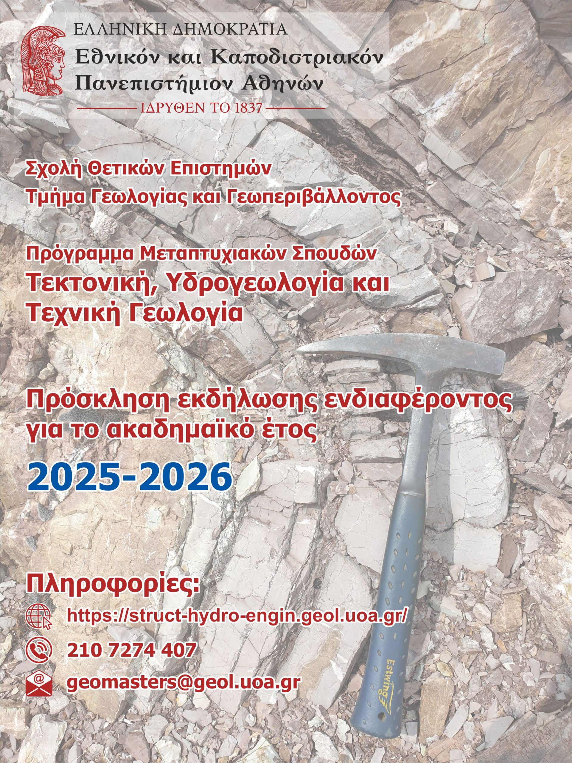 Το Τμήμα Γεωλογίας και Γεωπεριβάλλοντος του ΕΚΠΑ ανακοινώνει την ίδρυση ενός νέου Προγράμματος Μεταπτυχιακών Σπουδών (ΠΜΣ) με τίτλο: «Τεκτονική, Υδρογεωλογία και Τεχνική Γεωλογία» (Structural Geology and Tectonics, Hydrogeology and Engineering Geology).