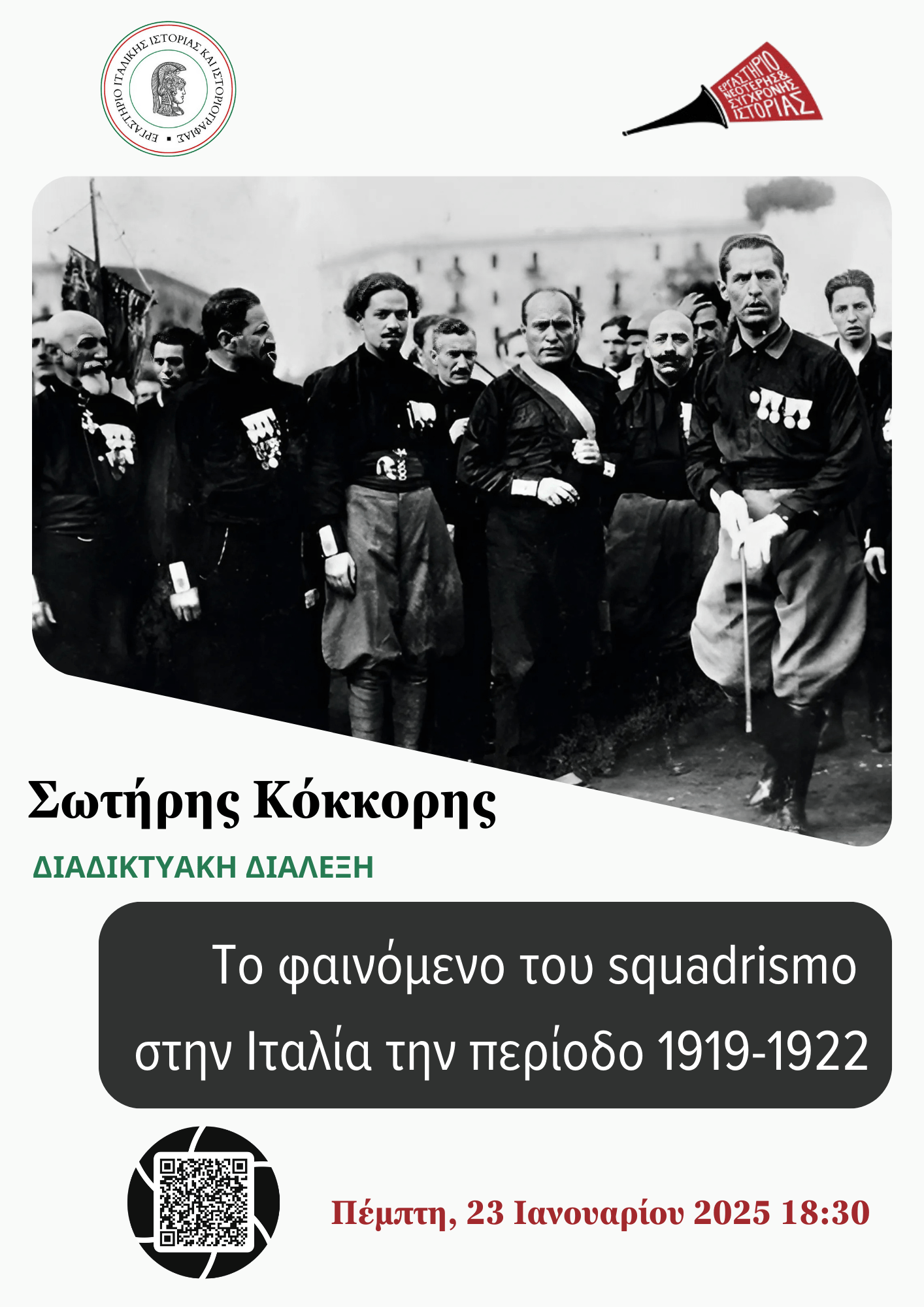 Το Eργαστήριο Ιταλικής Ιστορίας και Ιστοριογραφίας (Τμήμα Ιταλικής Γλώσσας και Φιλολογίας, ΕΚΠΑ) και το Εργαστήριο Νεότερης και Σύγχρονης Ιστορίας (Τμήμα Ιστορίας – Εθνολογίας, ΔΠΘ) σας προσκαλούν στη σεμιναριακή διάλεξη του Δρ. Σωτήρη Κόκκορη (ΕΚΠΑ) με θέμα: