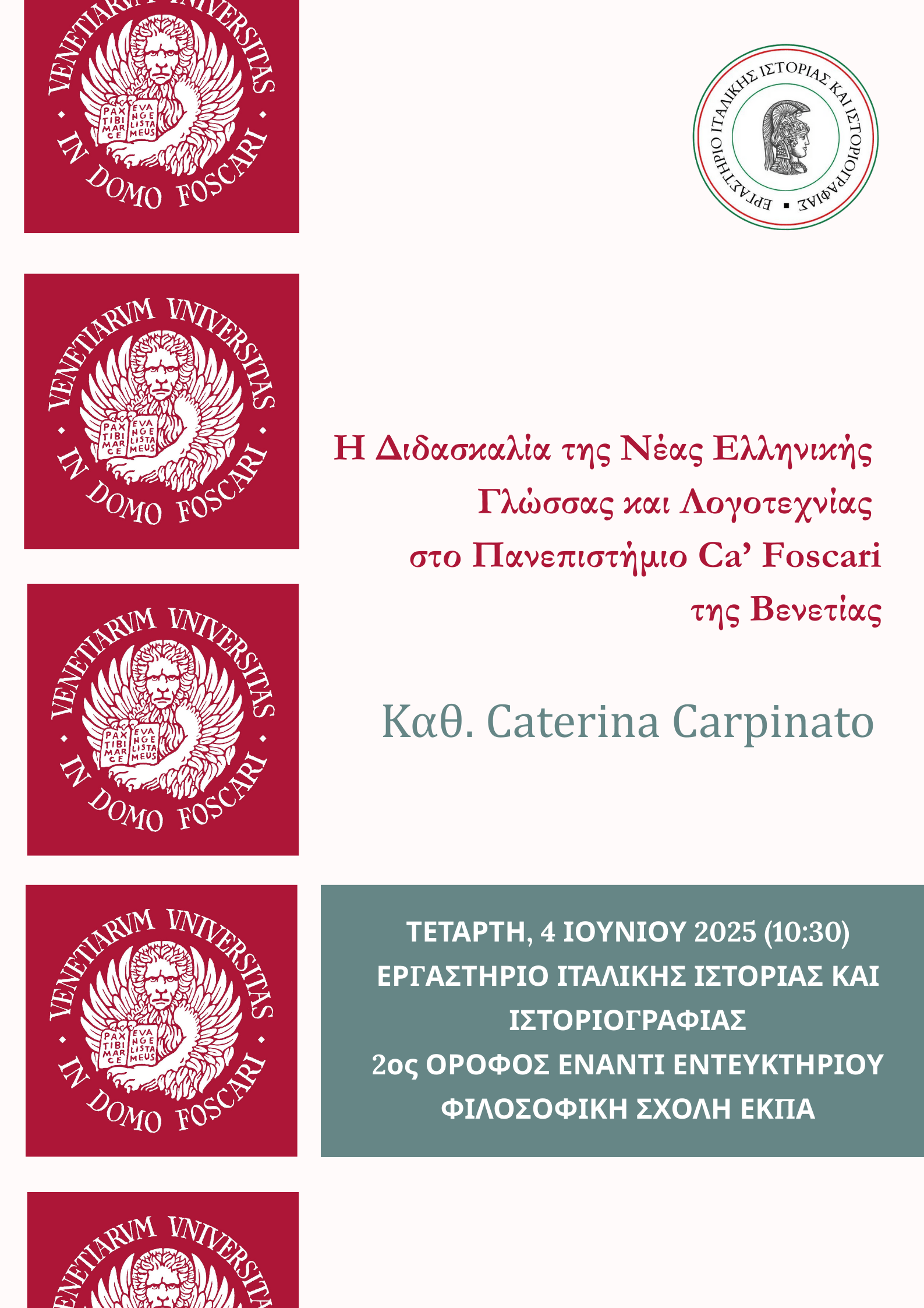 Το Εργαστήριο Ιταλικής Ιστορίας και Ιστοριογραφίας του Τμήματος Ιταλικής Γλώσσας και Φιλολογίας ΕΚΠΑ διοργανώνει σεμιναριακή διάλεξη της Καθ. Caterina Carpinato, Καθηγήτριας του Πανεπιστημίου Ca’ Foscari της Βενετίας, με θέμα