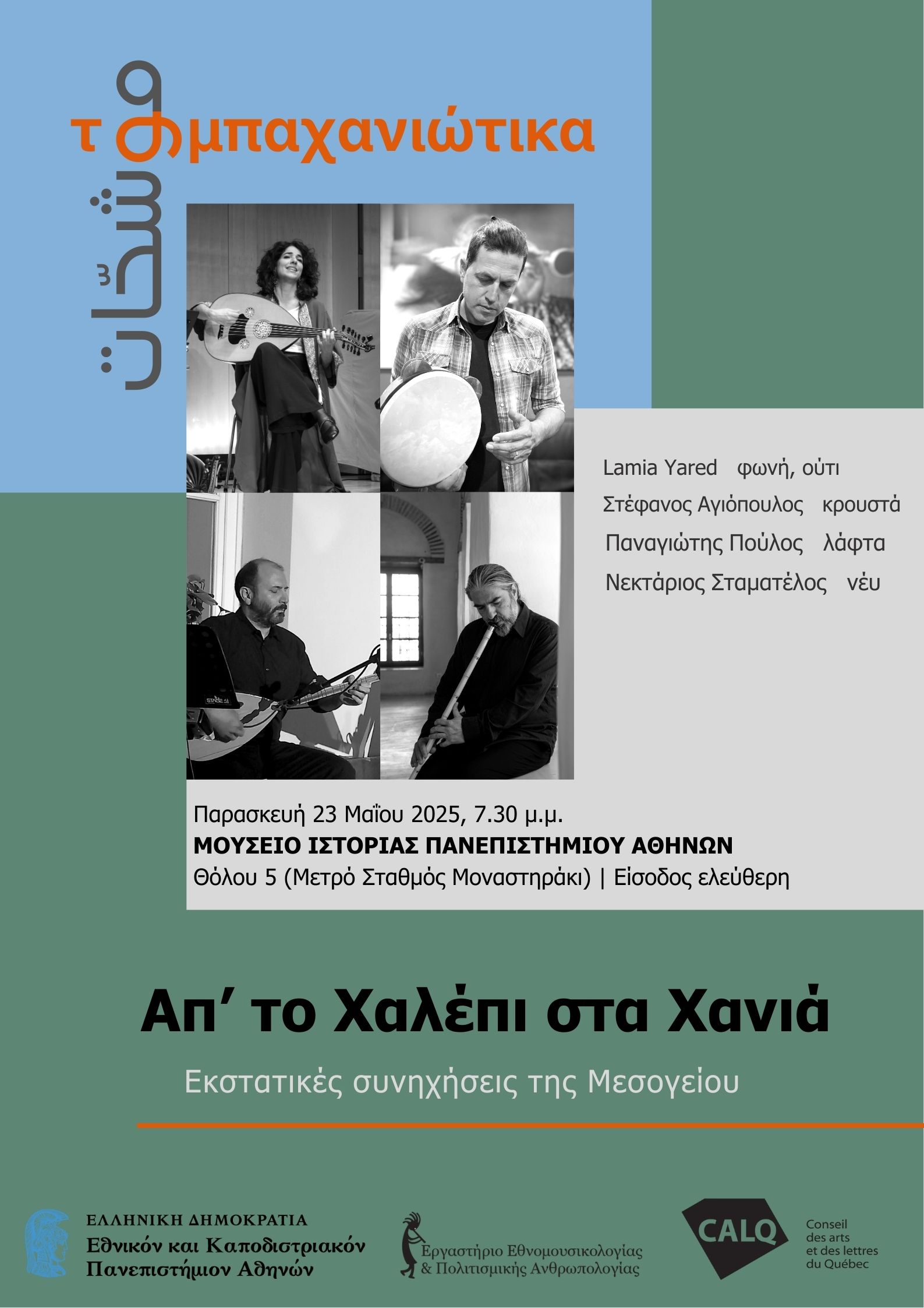 Το μουσικό πρόγραμμα Απ’ το Χαλέπι στα Χανιά: Εκστατικές συνηχήσεις της Μεσογείου φέρνει κοντά τέσσερις μουσικούς σ΄ ένα μοναδικό διάλογο μεταξύ των κλασικών αραβικών τραγουδιών μουασαχάτ και των ταμπαχανιώτικων, του μουσικού ρεπερτορίου της κρητικής μουσικής με έντονα στοιχεία από τις μουσικές της Εγγύς Ανατολής που διαμορφώθηκε στις αρχές του 20ου αιώνα. Η μουσική συνάντηση διαπνέεται από το τάραμπ, το εκστατικό συναίσθημα που μοιράζονται οι δυο μουσικές παραδόσεις. Η τραγουδίστρια Lamia Yared με το ούτι της, μαζί με τον Νεκτάριο Σταματέλο στο νέυ, τον Παναγιώτη Πούλο στο πολίτικο λαούτο (λάφτα) και το Στέφανο Αγιόπουλο στα κρουστά, ερμηνεύoυν επιλεγμένα τραγούδια ταμπαχανιώτικα και μουασαχάτ εξερευνώντας τις εκστατικές συνηχήσεις της Μεσογείου.