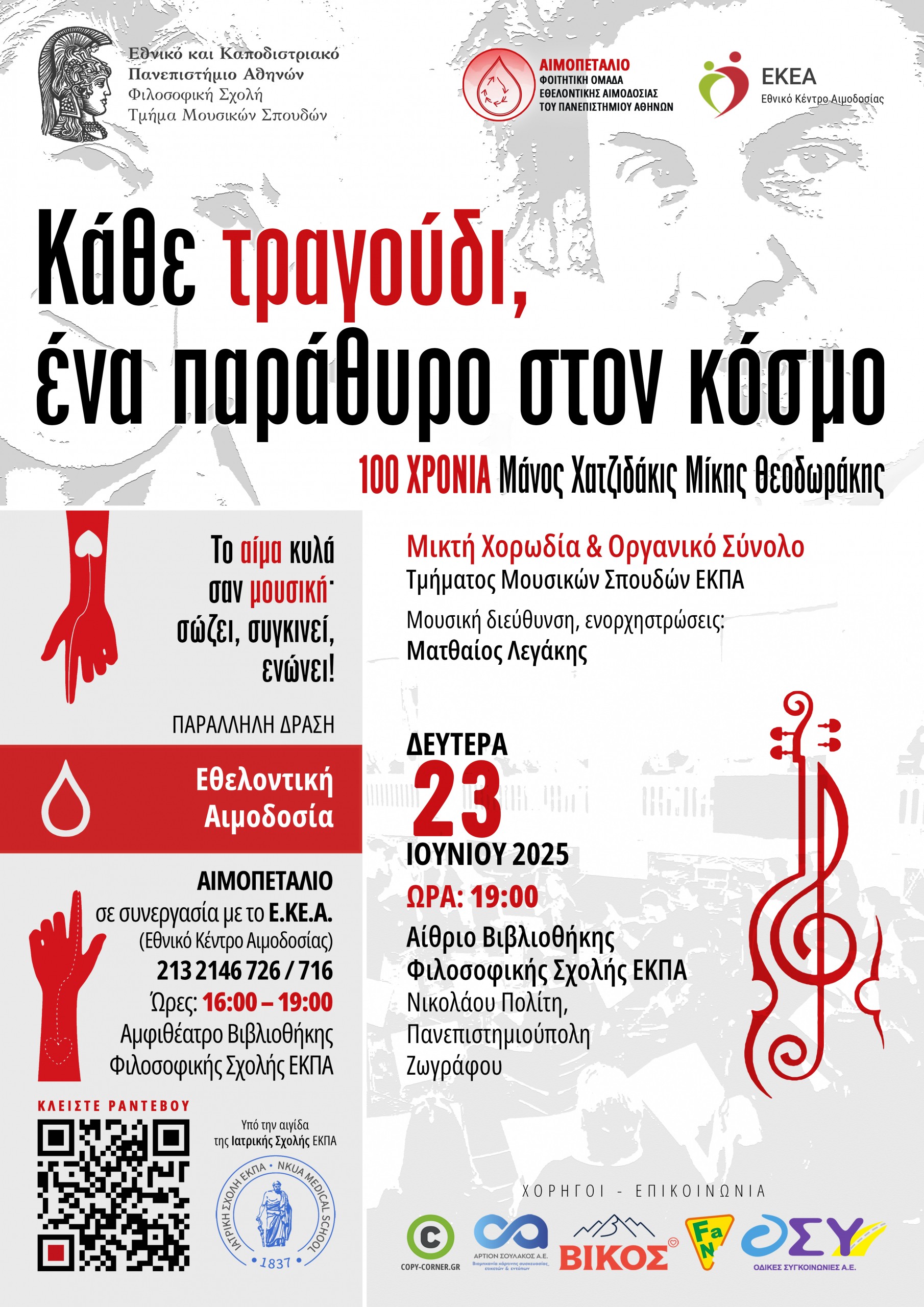 Το Τμήμα Μουσικών Σπουδών του Εθνικού και Καποδιστριακού Πανεπιστημίου Αθηνών διοργανώνει συναυλία με τίτλο «Κάθε τραγούδι, ένα παράθυρο στον κόσμο» – 100 χρόνια Μάνος Χατζιδάκις – Μίκης Θεοδωράκης, με τη συμμετοχή της Μικτής Χορωδίας και 9μελούς Οργανικού Συνόλου του Τμήματος, υπό τη μουσική διεύθυνση και τις ενορχηστρώσεις του μαέστρου Ματθαίου Λεγάκη.