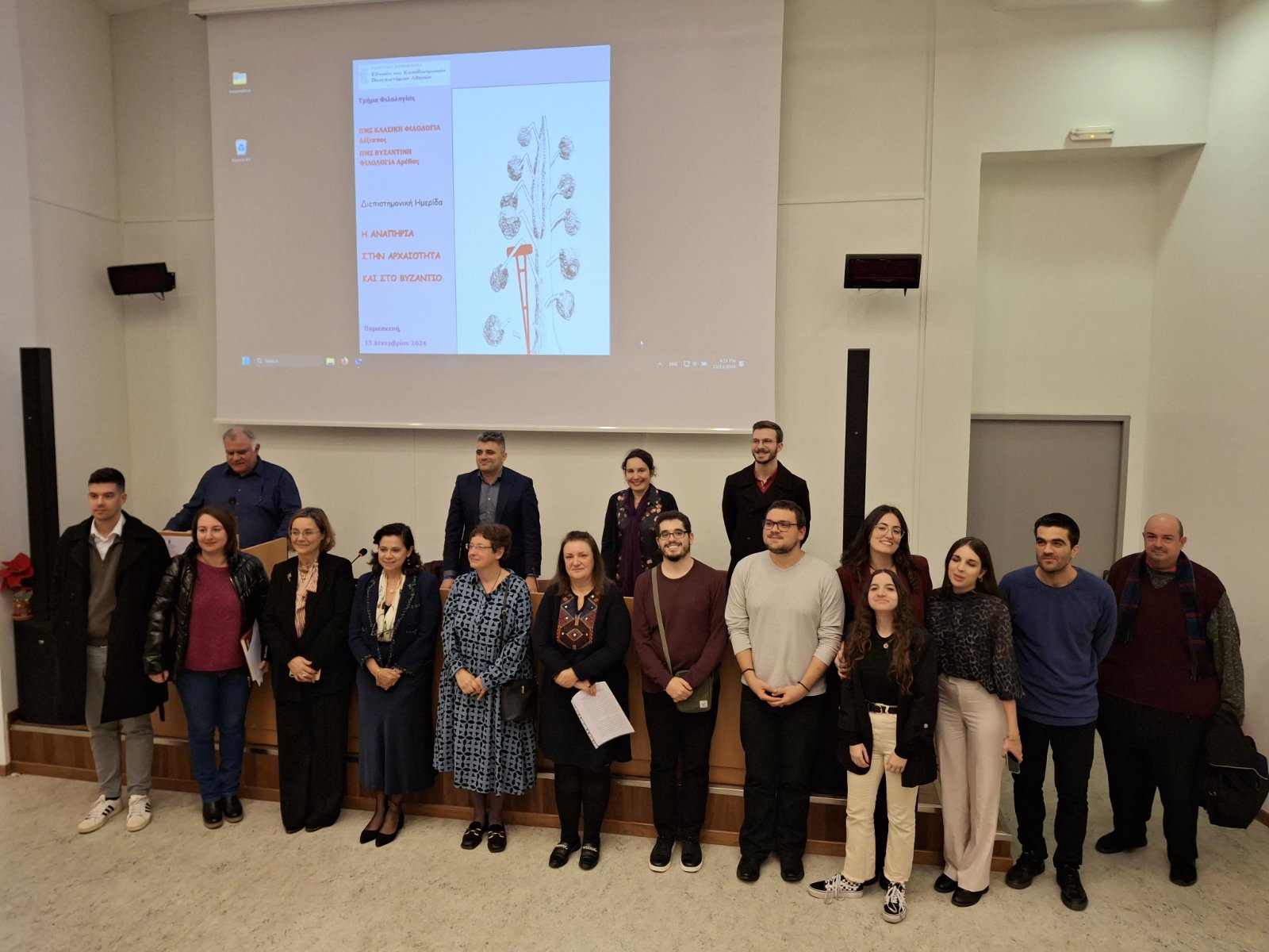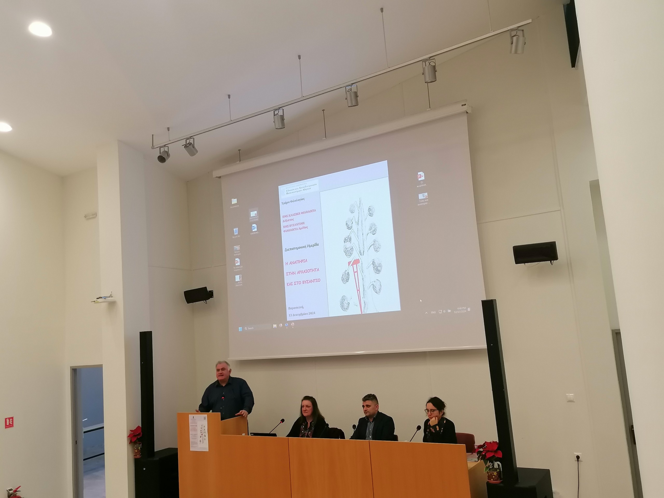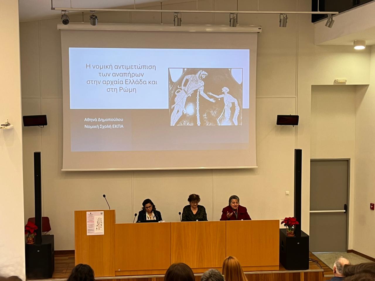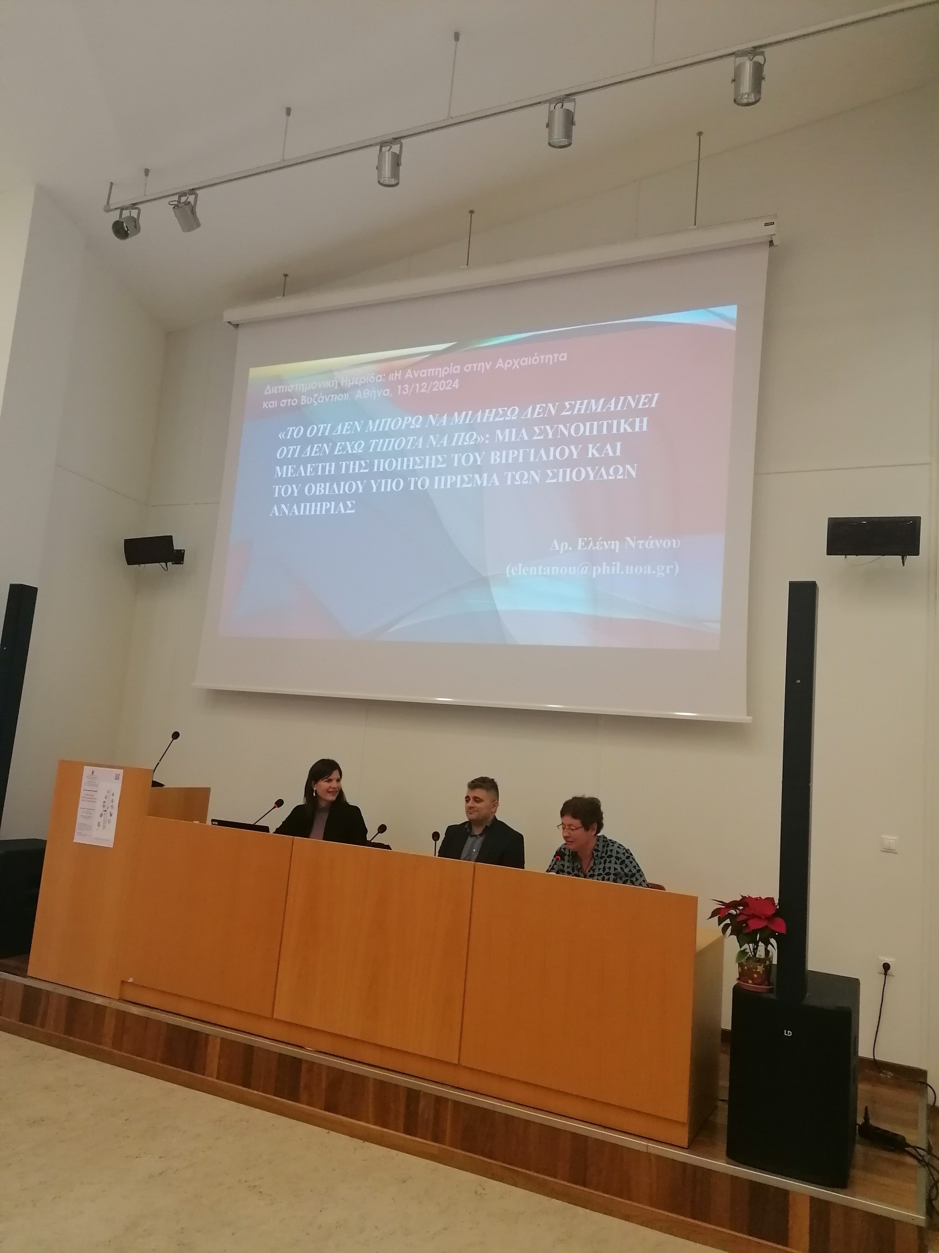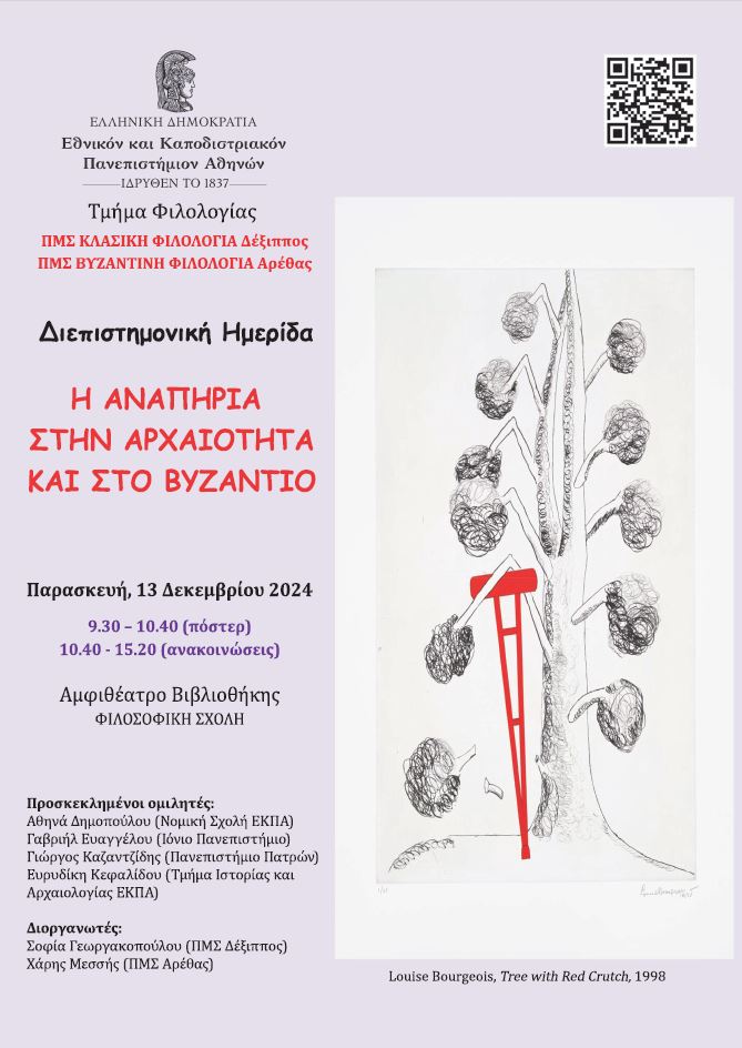 Την Παρασκευή, 13 Δεκεμβρίου 2024, πραγματοποιήθηκε με ιδιαίτερη επιτυχία διεπιστημονική ημερίδα από το μάστερ Κλασικής Φιλολογίας «Δέξιππος» και το μάστερ Βυζαντινής Φιλολογίας «Αρέθας» του Τμήματος Φιλολογίας του ΕΚΠΑ, με θέμα: “Η αναπηρία στην Αρχαιότητα και στο Βυζάντιο” και διοργανωτές την κ. Σοφία Γεωργακοπούλου, Καθηγήτρια Λατινικής Φιλολογίας, Διευθύντρια του μάστερ «Δέξιππος», και τον κ. Χάρη Μεσσή, ΕΔΙΠ Βυζαντινής Φιλολογίας. Όπως επεσήμανε ο Κοσμήτορας της Φιλοσοφικής Σχολής, κ. Δημήτριος Δρόσος, η ημερίδα είναι μια σημαντική πρωτοβουλία των δύο δωρεάν μάστερ του Τμήματος Φιλολογίας, του «Δεξίππου» και του «Αρέθα», η οποία ξεχωρίζει για δύο βασικά χαρακτηριστικά, πρώτον για τον διεπιστημονικό της χαρακτήρα, καθώς συνδυάζει ερευνητικά εργαλεία και μεθοδολογικές προσεγγίσεις από διαφορετικά επιστημονικά πεδία, και δεύτερον, εξίσου σημαντικό και καινοφανές, για τις επιτοίχιες ανακοινώσεις (πόστερ), που απορρέουν από τη συνεργασία Καθηγητών και νέων επιστημόνων, μεταπτυχιακών φοιτητών και υποψηφίων διδακτόρων, σε μια συστηματική διερεύνηση ενός φαινομένου, που αποτελεί διαχρονικά ουσιαστικό δείκτη του πολιτισμικού επιπέδου των κοινωνιών μας. Η μελέτη της αναπηρίας στον αρχαίο και τον βυζαντινό κόσμο δεν αποτελεί απλώς ένα πεδίο έρευνας, αλλά αναδεικνύει έμπρακτα τον ανθρωπιστικό χαρακτήρα των σπουδών μας.\