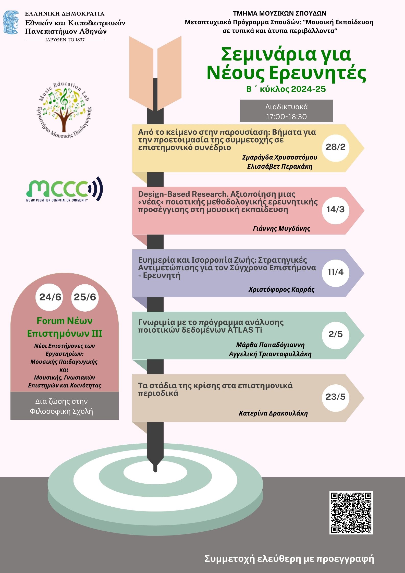Τα Εργαστήρια Μουσικής Παιδαγωγικής και Μουσικής, Γνωσιακών Επιστημών και Κοινότητας και το Πρόγραμμα Μεταπτυχιακών Σπουδών Μουσική Εκπαίδευση σε Τυπικά και Άτυπα Περιβάλλοντα του Τμήματος Μουσικών Σπουδών του ΕΚΠΑ, συνδιοργανώνουν τον Β’ Κύκλο σεμιναρίων για Νέους/ες Ερευνητές/τριες κατά το Εαρινό Εξάμηνο 2025.