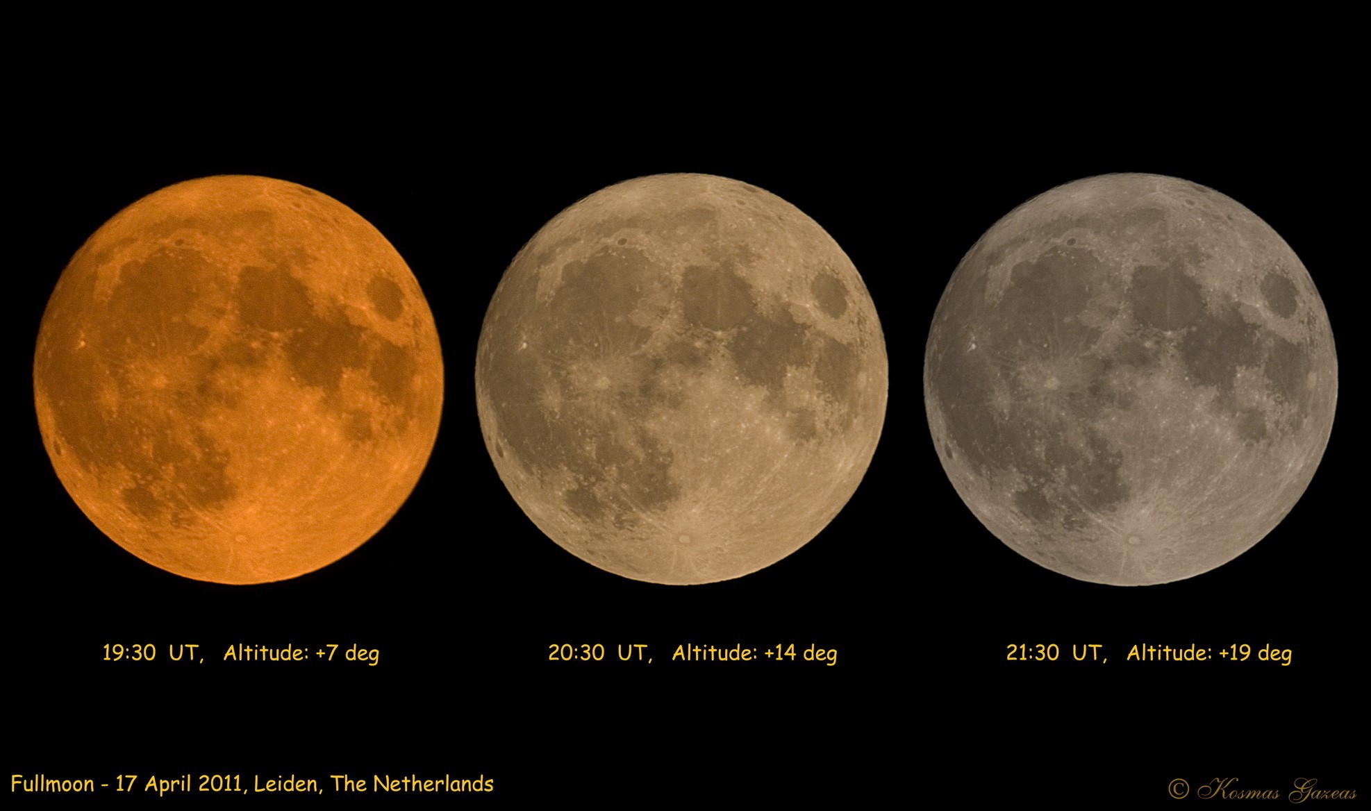 Η Πανσέληνος, όπως αποτυπώθηκε στις 17/18 Απριλίου 2011 από το Leiden της Ολλανδίας σε τρία στιγμιότυπα που έχουν ληφθεί καθώς η Σελήνη ανέτειλε.