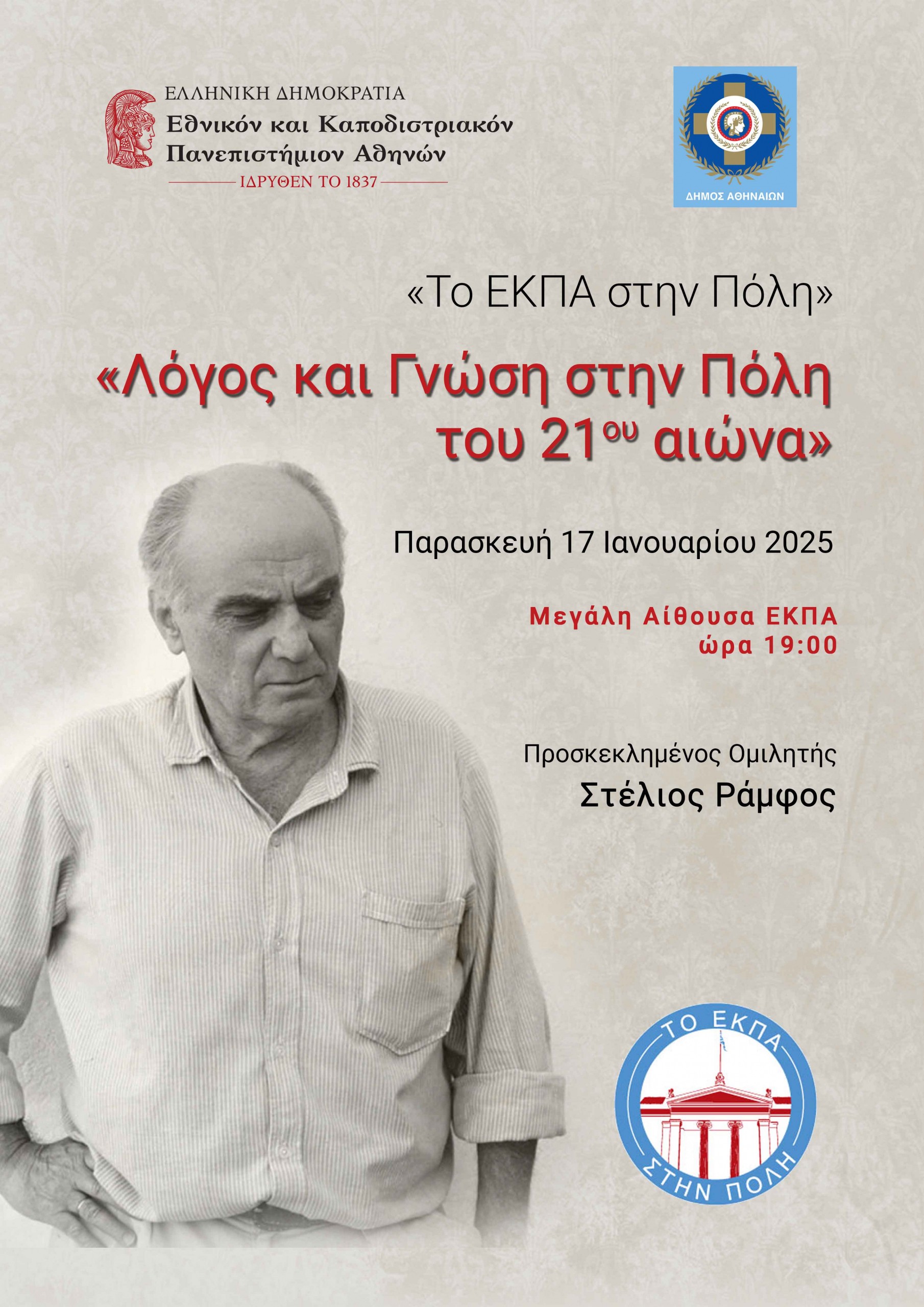 Μετά την ευμενέστατη υποδοχή των εκδηλώσεων του ακαδημαϊκού έτους 2023-24, η σειρά συνεχίζεται για δεύτερη χρονιά, με προσκεκλημένο τον Στέλιο Ράμφο, ο οποίος την Παρασκευή 17 Ιανουαρίου 2025, στη Μεγάλη Αίθουσα του ΕΚΠΑ (ώρα 19:00), θα συνομιλήσει με το ακροατήριό του, επιχειρώντας μιαν ερμηνεία του τίτλου της ενότητας («Λόγος και Γνώση στην Πόλη του 21ου αιώνα»): τι είναι «Λόγος» και τι είναι «Γνώση» στη σημερινή εποχή, «στην Πόλη του 21ου αιώνα».