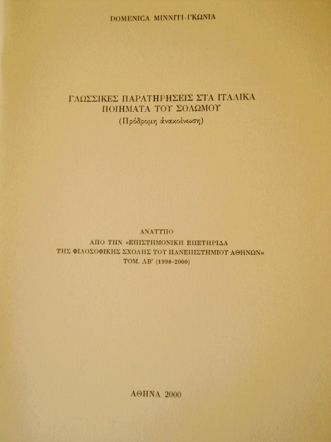Η γλώσσα του ιταλικού έργου του Σολωμού (Ζάκυνθος 1798 – Κέρκυρα 1857) δεν έχει ακόμα εξεταστεί σε επαρκή βαθμό. Ειδικά το λεξιλόγιό του, αξίζει να μελετηθεί πιο αναλυτικά και σε βάθος, ώστε να αναδειχτεί ο μεγάλος λεκτικός πλούτος που το χαρακτηρίζει. Μέχρι σήμερα διαθέτουμε το πολύτιμο Λεξικό ελληνόγλωσσου σολωμικού έργου (Πανεπιστήμιο Ιωαννίνων, 1983), δεν διαθέτουμε ωστόσο κάτι παρόμοιο για το ιταλόγλωσσο έργο του. Το γλωσσάριο που ετοιμάζεται, φιλοδοξεί να συμπληρώσει τον γλωσσικό θησαυρό του Εθνικού μας Ποιητή, καλύπτοντας παράλληλα σημαντικά desiderata στις σολωμικές σπουδές.
