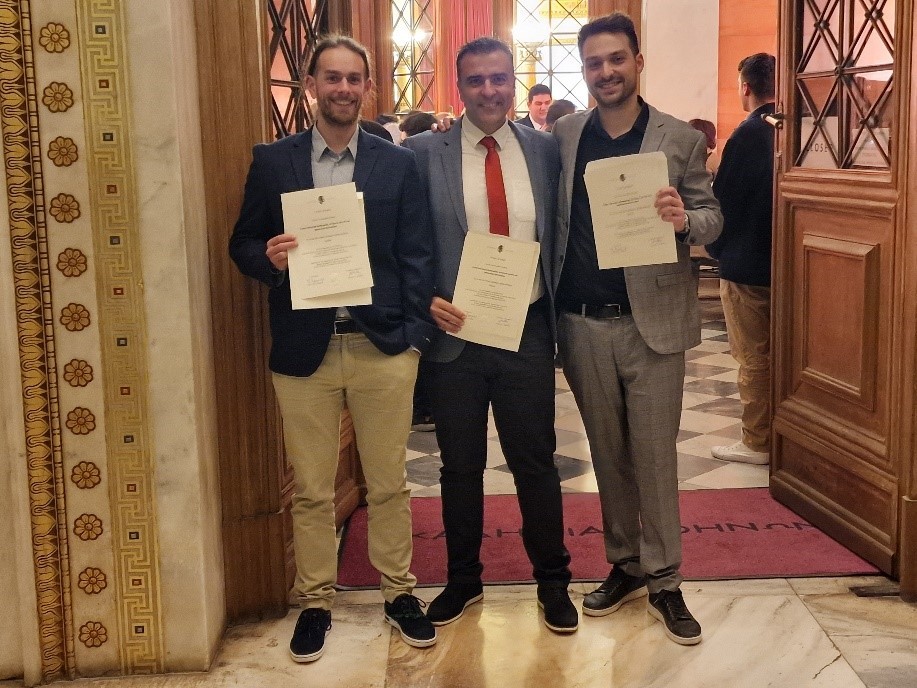 Την Πέμπτη 19 Δεκεμβρίου 2024, στην Πανηγυρική Συνεδρία της Ακαδημίας Αθηνών, οι Δρ Κωνσταντίνος Βορεάκος, Δρ Άγγελος Λέλης και Νικόλαος Σκουλίκας βραβεύτηκαν με το Βραβείο «Χίλδεγαρδ χήρας Λεωνίδα Ζέρβα» το οποίο απονέμεται για την καλύτερη πρωτότυπη ερευνητική εργασία στο πεδίο της Οργανικής Χημείας. Η διακριθείσα ερευνητική εργασία, η οποία εκπονήθηκε στο Εργαστήριο Οργανικής Χημείας του Τμήματος Χημείας του ΕΚΠΑ και συγκεκριμένα στην ερευνητική ομάδα του Καθηγητή Δ. Γεωργιάδη, δημοσιεύτηκε τον Σεπτέμβριο του 2023 στο υψηλής απήχησης επιστημονικό περιοδικό Organic Letters με τίτλο «Diastereoselective Synthesis of Phosphinic Dipeptide Isosteres: Domino Chirality Transfer during a Stereocontrolled P-Michael Reaction». Στην εργασία περιγράφεται η επίλυση ενός μακροχρόνιου συνθετικού προβλήματος στο πεδίο των φωσφινικών πεπτιδίων, μιας κατηγορίας φαρμακευτικά χρήσιμων ενώσεων με εφαρμογές στην ανάπτυξη αναστολέων των μεταλλοπρωτεασών Zn. Συγκεκριμένα, προτείνεται μια πρακτική μεθοδολογία που επιτρέπει τη διαστερεοεκλεκτική σύνθεση ψευδοδιπεπτιδικών μονάδων, η οποία χαρακτηρίζεται από συνθετική ευκολία, δυνατότητα επέκτασης σε συνθέσεις μεγάλης κλίμακας και εύκολα προσβάσιμες πρώτες ύλες. Περισσότερες πληροφορίες για την εργασία μπορείτε να βρείτε στον σύνδεσμο: https://pubs.acs.org/doi/10.1021/acs.orglett.3c02335